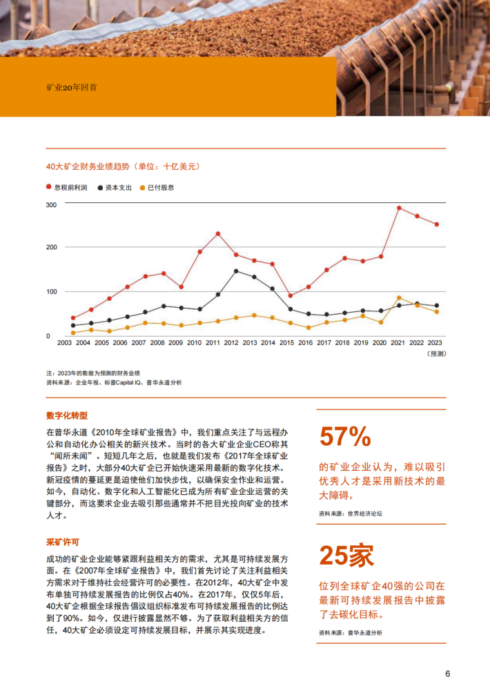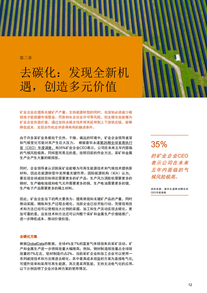 此外,去碳化的任务也相当紧迫。矿业企业将不得不提高产量,以满足对能源转型所需的关键矿产和其他商品日益增长的需求,但他们也深知必须降低碳排放。超过三分之一的矿业CEO认为他们的公司高度或极度暴露在气候相关风险中。好消息是,去碳化可以帮助矿业企业在价值链的各个环节创造价值。我们看到越来越多的矿业企业通过低碳技术和方法提高效率,与矿产加工企业合作生产出客户越来越需要的“绿色金属”,并获得与可持续发展相挂钩的融资。