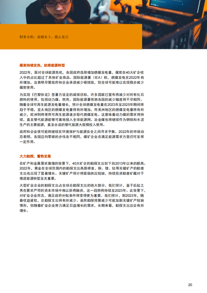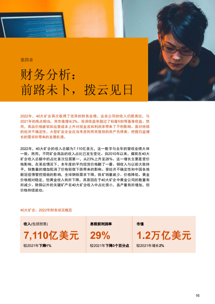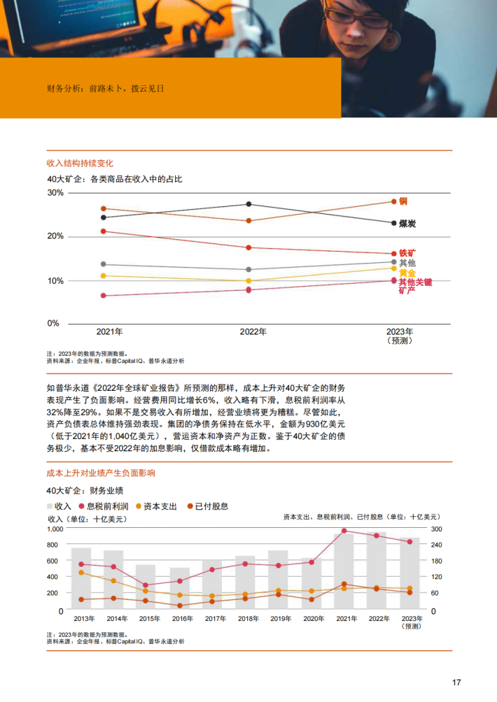 然而,向可再生能源和低排放经济的过渡不会是一帆风顺的,也不会改变矿业企业的格局。2022年,前40大矿业企业公布了强劲的财务表现;合计总收入为7,110亿美元,几乎与2021年的高点相当。他们的资产负债表很稳健,债务仍然很低,但EBITDA(息税前利润)则如预测一样,由于成本膨胀及经济不确定性等原因呈现下降趋势。