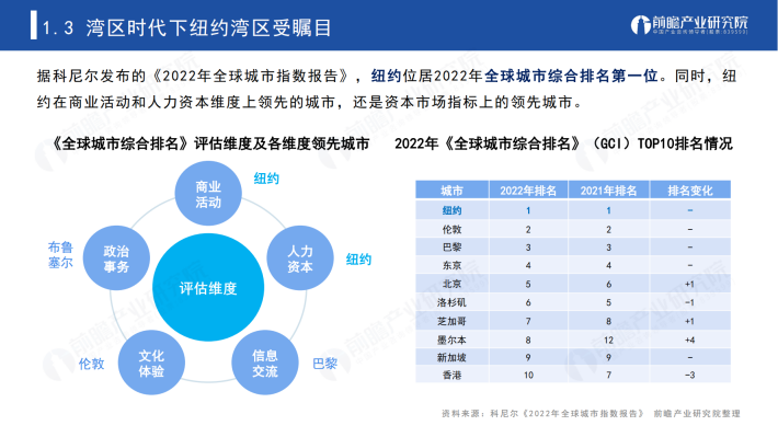 据科尼尔发布的《2022年全球城市指数报告》,纽约位居2022年全球城市综合排名第一位。同时,纽约在商业活动和人力资本维度上领先的城市,还是资本市场指标上的领先城市。