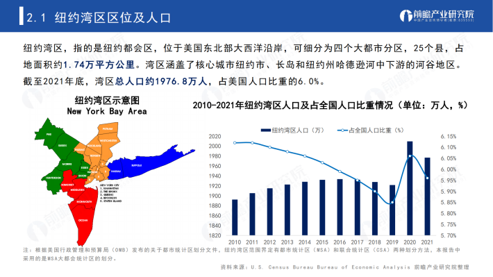 纽约湾区,指的是纽约都会区,位于美国东北部大西洋沿岸,可细分为四个大都市分区,25个县,占地面积约1.74万平方公里。湾区涵盖了核心城市纽约市、长岛和纽约州哈德逊河中下游的河谷地区。截至2021年底,湾区总人口约1976.8万人,占美国人口比重的6.0%。