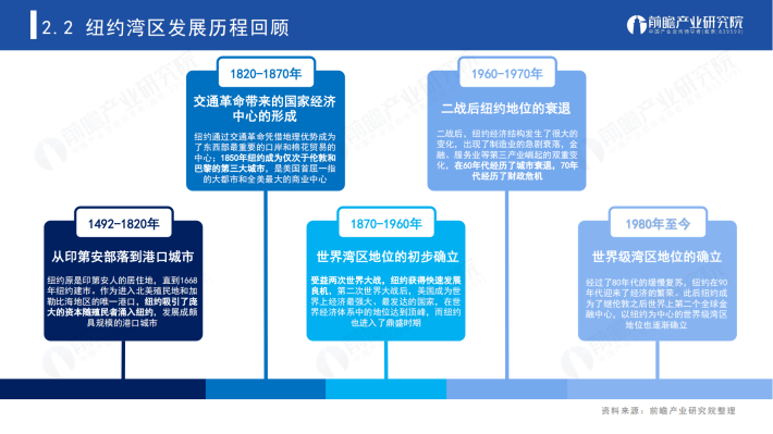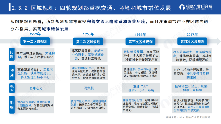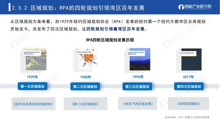 从区域规划方案来看,自1929年纽约区域规划协会(RPA)发表的纽约第一个纽约大都市区总体规划开始至今,共发布了四次区域规划,这四轮规划引领着湾区百年发展。