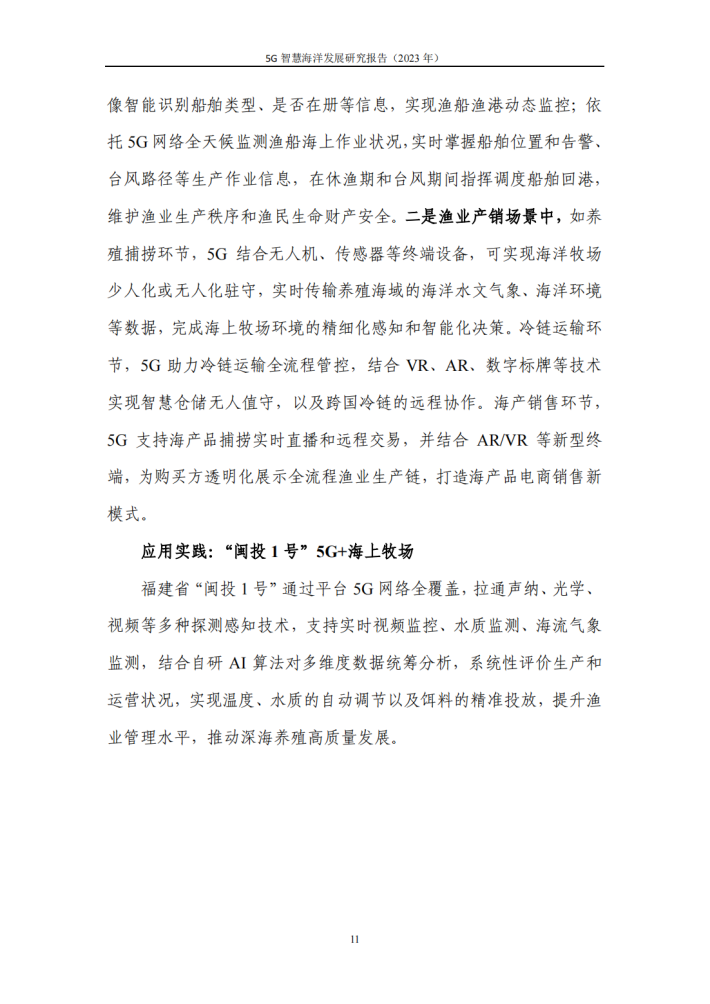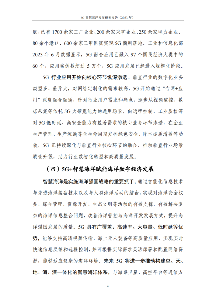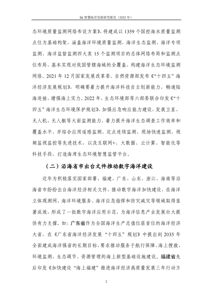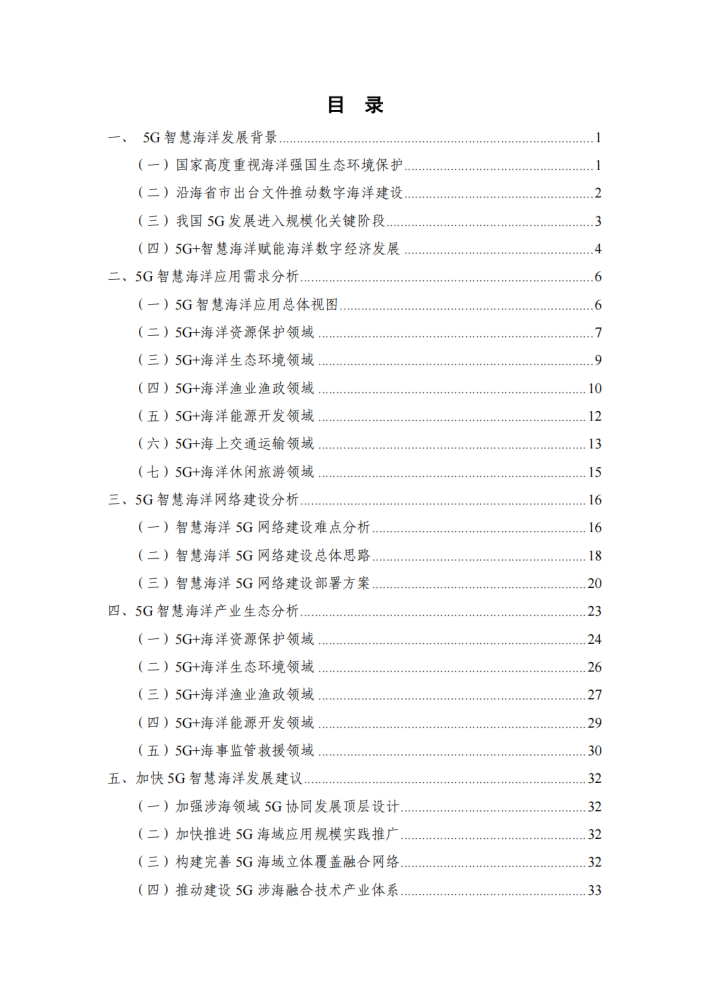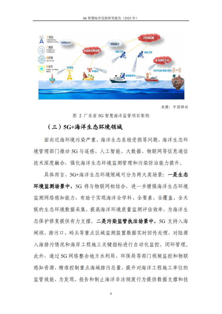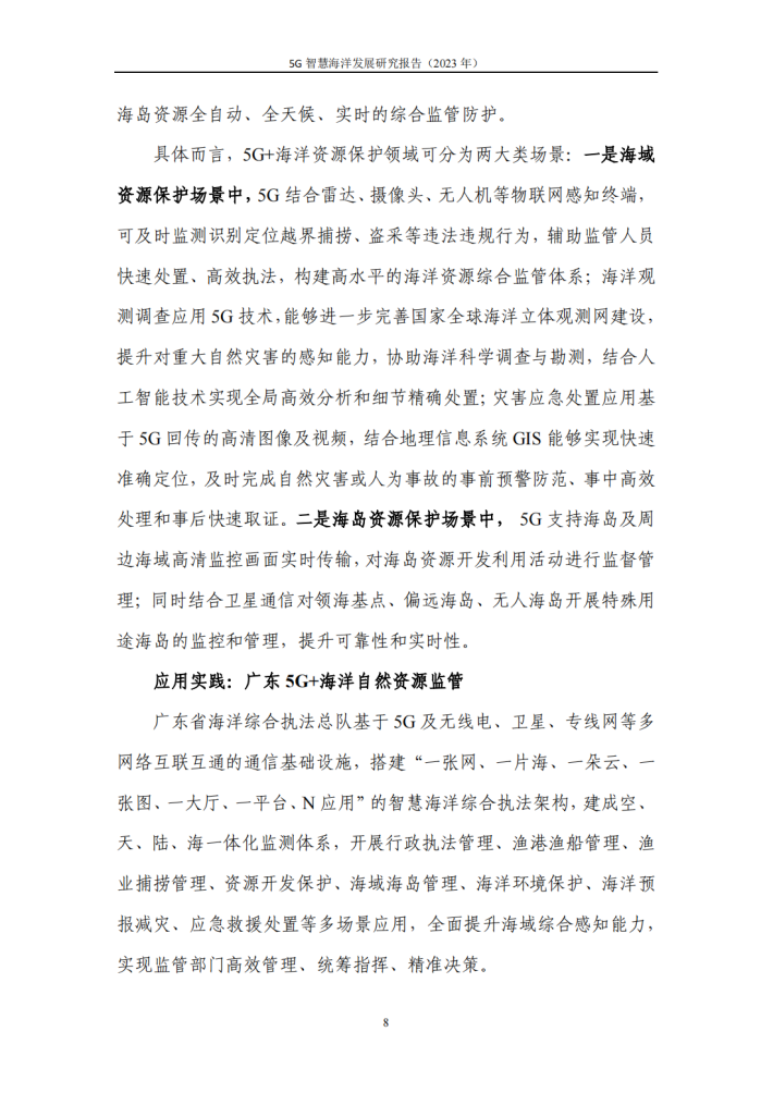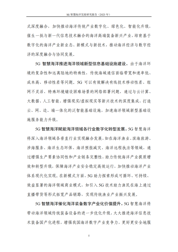 5G智慧海洋将以服务海洋经济发展和海洋生态环境保护为宗旨,以5G为代表的新一代信息通信技术为支撑,以政府、企业和公众为服务对象,涵盖自然资源、生态环境、农业、能源、交通、旅游等涉海领域,加快推进数字海洋信息基础设施建设,推动海洋传统行业数字化、绿色化、智能化升级,催生一批海洋产业新业态、新模式与新装备,推动海洋经济与数字经济的深度融合与协同发展。