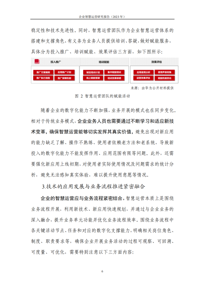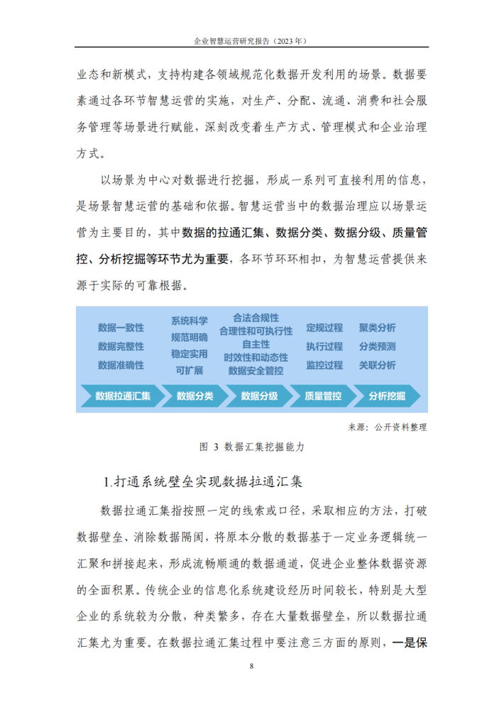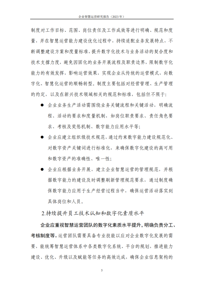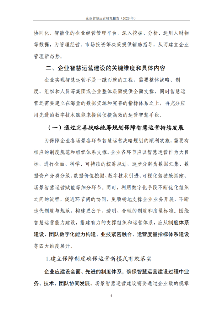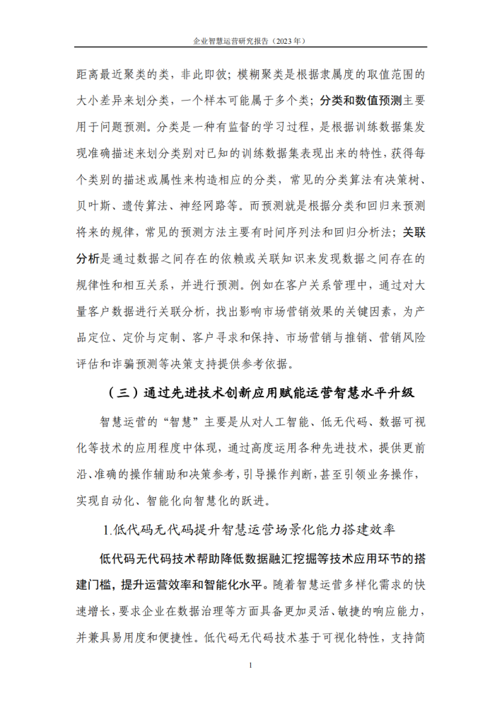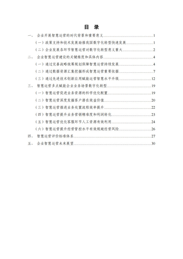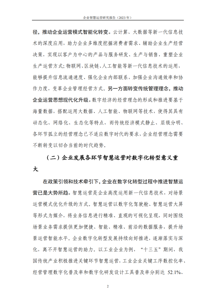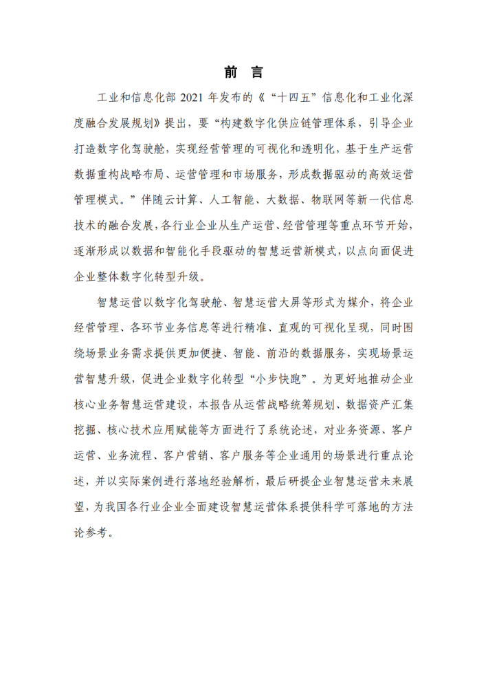 智慧运营以数字化驾驶舱、智慧运营大屏等形式为媒介,将企业经营管理、各环节业务信息等进行精准、直观的可视化呈现,同时围绕场景业务需求提供更加便捷、智能、前沿的数据服务,实现场景运营智慧升级,促进企业数字化转型“小步快跑”。为更好地推动企业核心业务智慧运营建设,本报告从运营战略统筹规划、数据资产汇集挖掘、核心技术应用赋能等方面进行了系统论述,对业务资源、客户运营、业务流程、客户营销、客户服务等企业通用的场景进行重点论述,并以实际案例进行落地经验解析,最后研提企业智慧运营未来展望,为我国各行业企业全面建设智慧运营体系提供科学可落地的方法论参考。