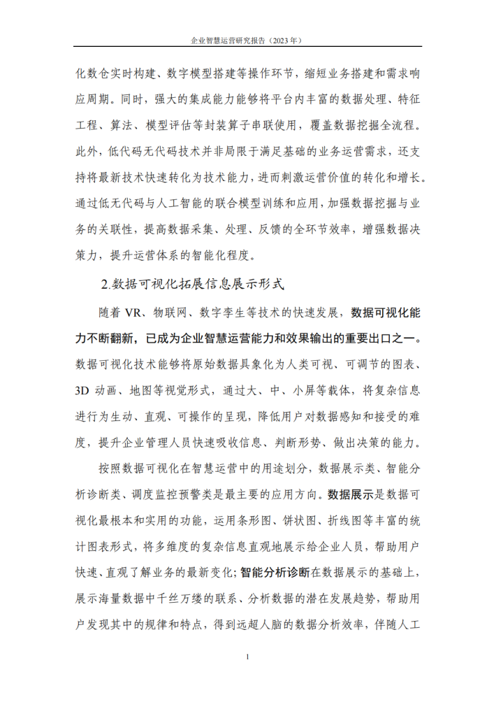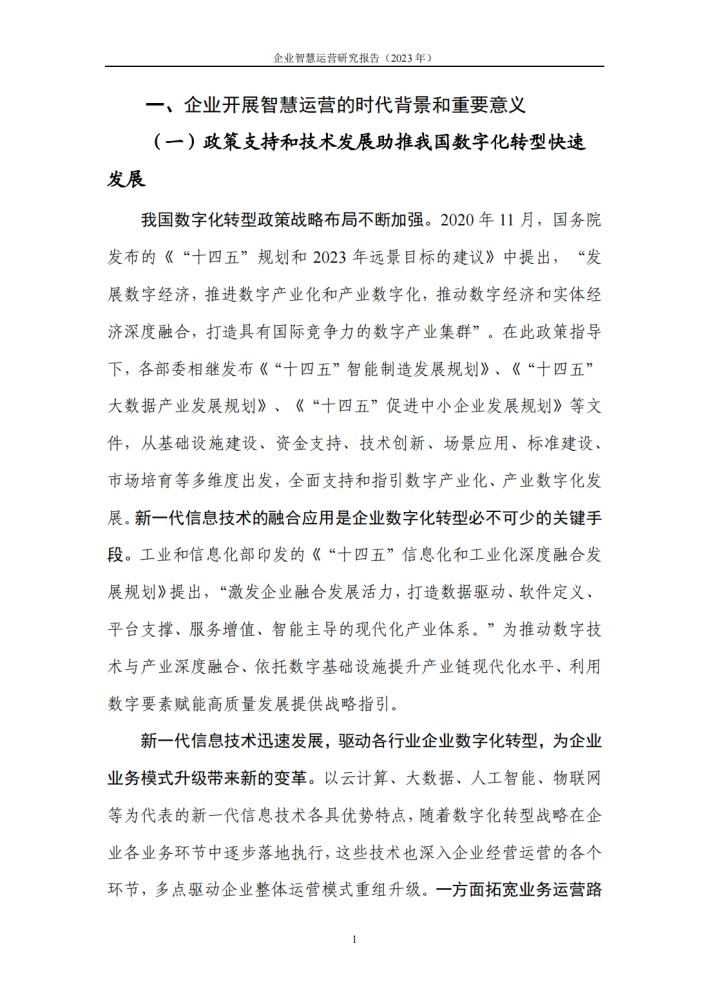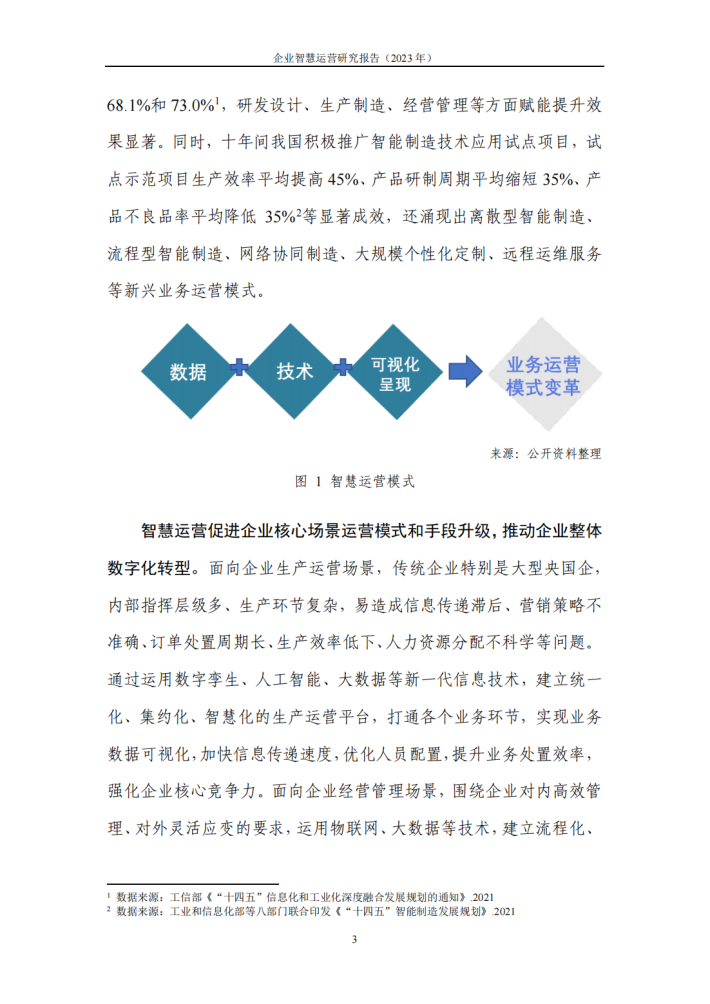 工业和信息化部2021年发布的《“十四五”信息化和工业化深度融合发展规划》提出,要“构建数字化供应链管理体系,引导企业打造数字化驾驶舱,实现经营管理的可视化和透明化,基于生产运营数据重构战略布局、运营管理和市场服务,形成数据驱动的高效运营管理模式。”伴随云计算、人工智能、大数据、物联网等新一代信息技术的融合发展,各行业企业从生产运营、经营管理等重点环节开始,逐渐形成以数据和智能化手段驱动的智慧运营新模式,以点向面促进企业整体数字化转型升级。