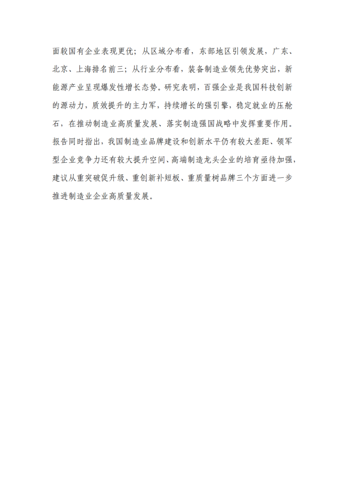 研究表明,百强企业是我国科技创新的源动力,质效提升的主力军,持续增长的强引擎,稳定就业的压舱石,在推动制造业高质量发展、落实制造强国战略中发挥重要作用。报告同时指出,我国制造业品牌建设和创新水平仍有较大差距、领军型企业竞争力还有较大提升空间、高端制造龙头企业的培育亟待加强,建议从重突破促升级、重创新补短板、重质量树品牌三个方面进一步推进制造业企业高质量发展。
