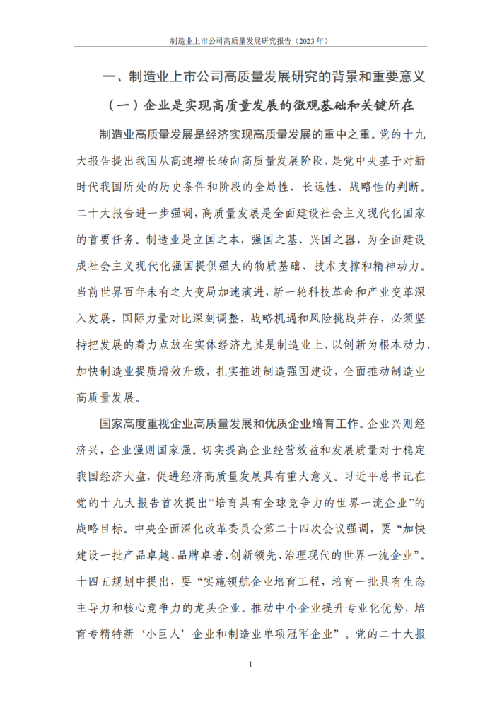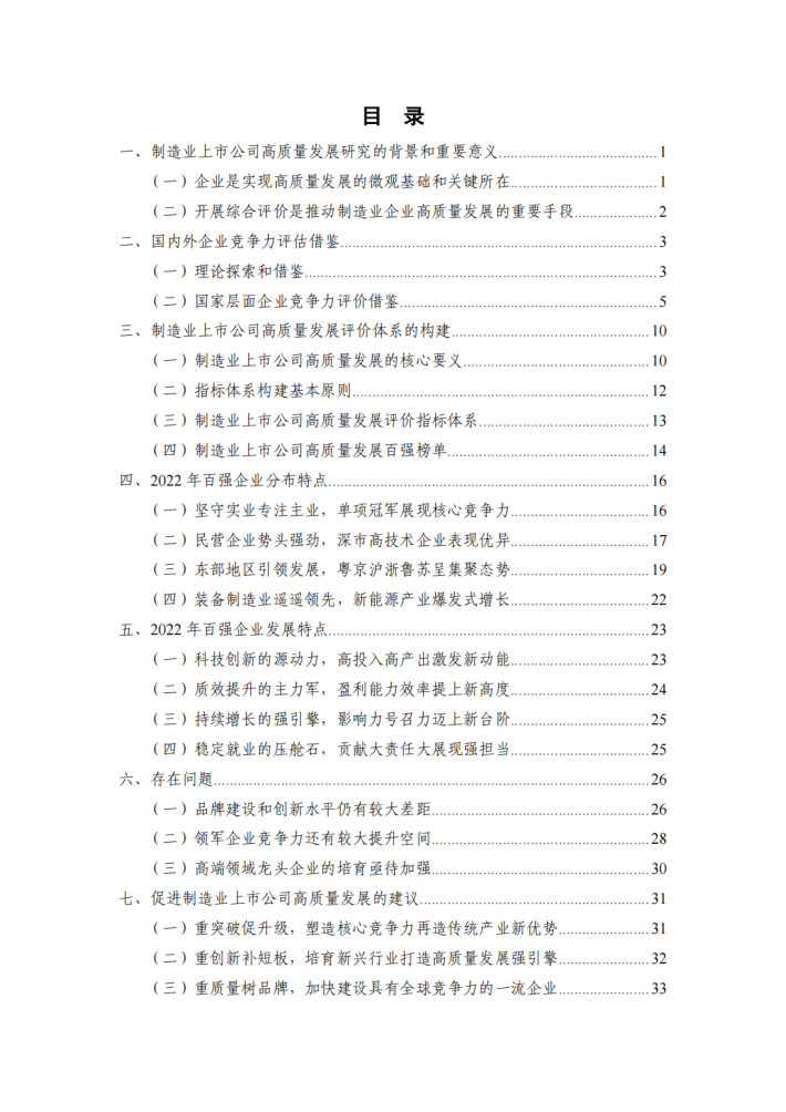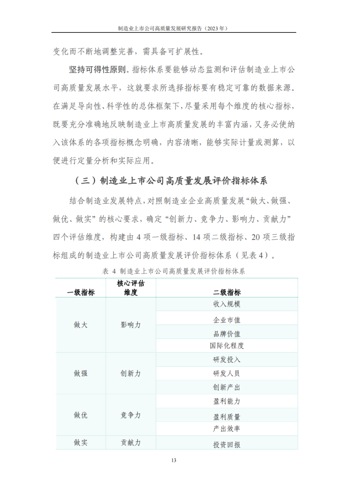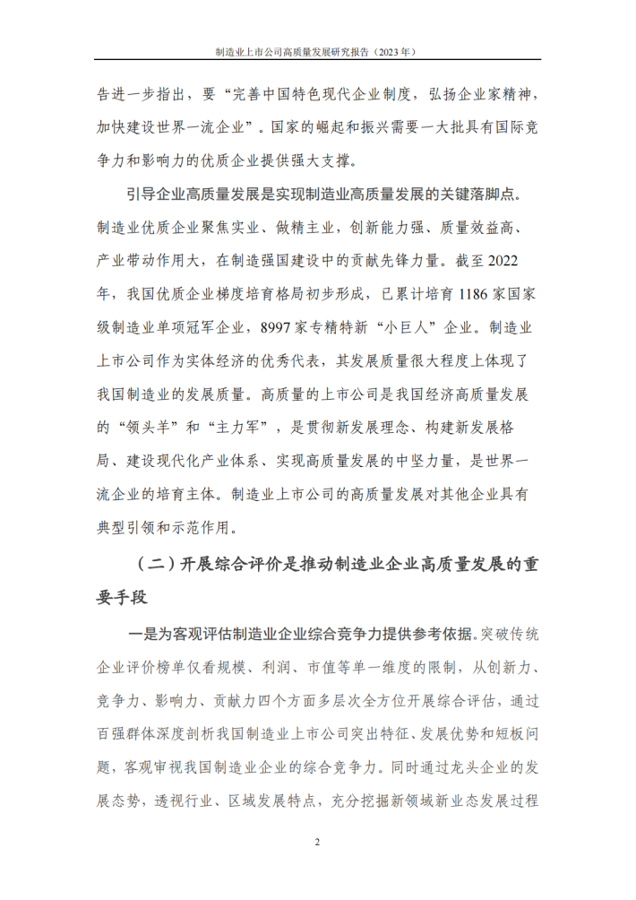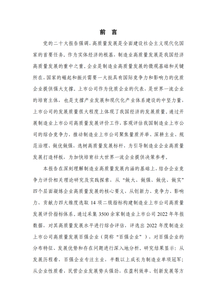 本报告在深刻理解制造业高质量发展内涵的基础上,结合企业竞争力评价相关理论研究及实践探索,从“做大、做强、做优、做实”四个层面凝练企业高质量发展的核心要义,从创新力、竞争力、影响力、贡献力四大维度选取14项二级指标构建制造业上市公司高质量发展评价指标体系。通过采集3500余家制造业上市公司2022年年报数据,对其高质量发展水平进行综合评估,评选出2022年度制造业上市公司高质量发展百强企业(简称“百强企业”),对百强企业的分布特征、发展优势和存在问题进行深入地分析。