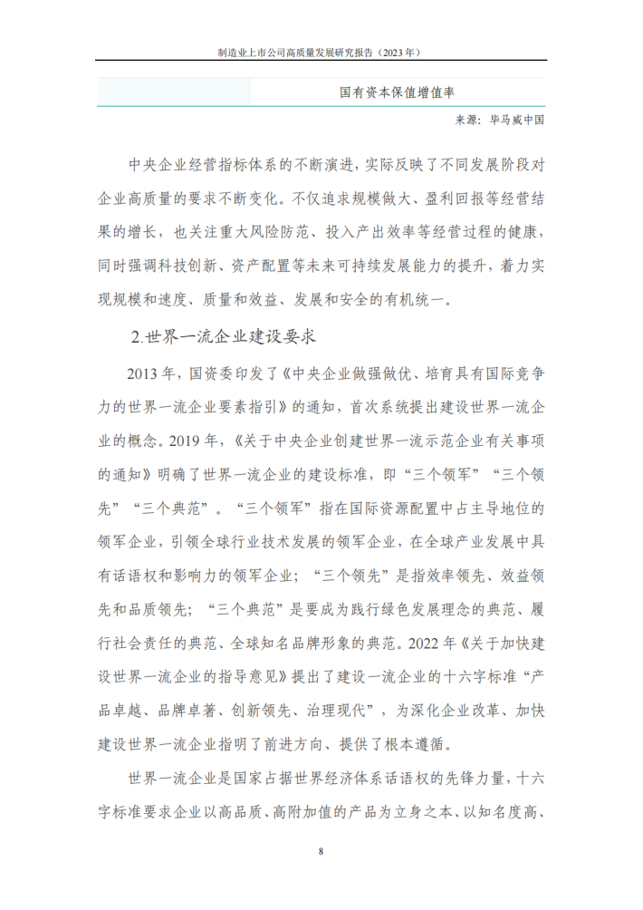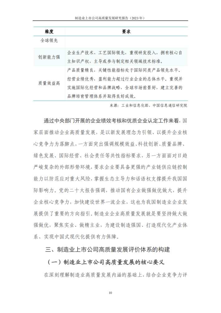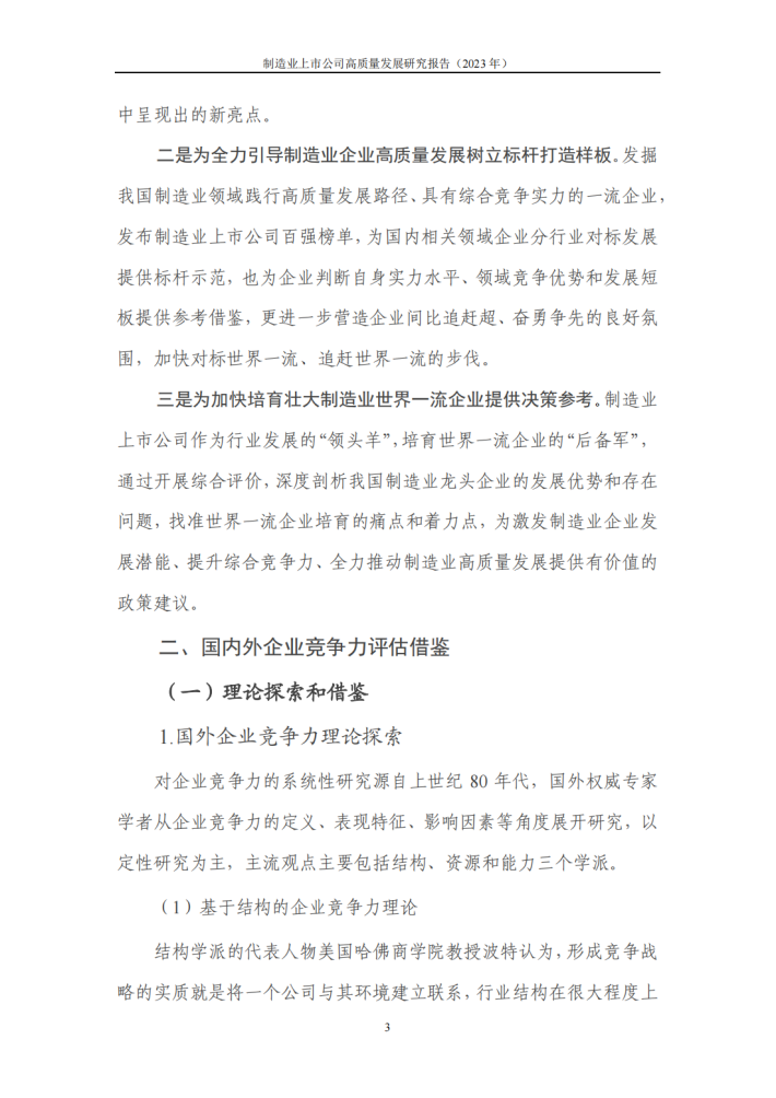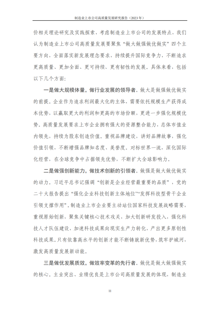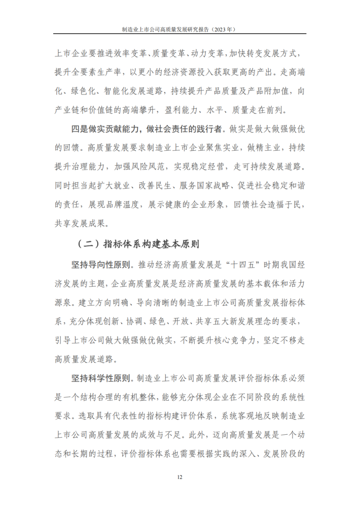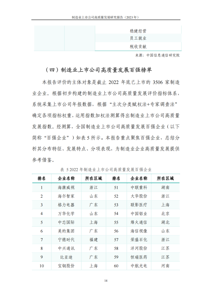 本报告在深刻理解制造业高质量发展内涵的基础上,结合企业竞争力评价相关理论研究及实践探索,从“做大、做强、做优、做实”四个层面凝练企业高质量发展的核心要义,从创新力、竞争力、影响力、贡献力四大维度选取14项二级指标构建制造业上市公司高质量发展评价指标体系。通过采集3500余家制造业上市公司2022年年报数据,对其高质量发展水平进行综合评估,评选出2022年度制造业上市公司高质量发展百强企业(简称“百强企业”),对百强企业的分布特征、发展优势和存在问题进行深入地分析。
