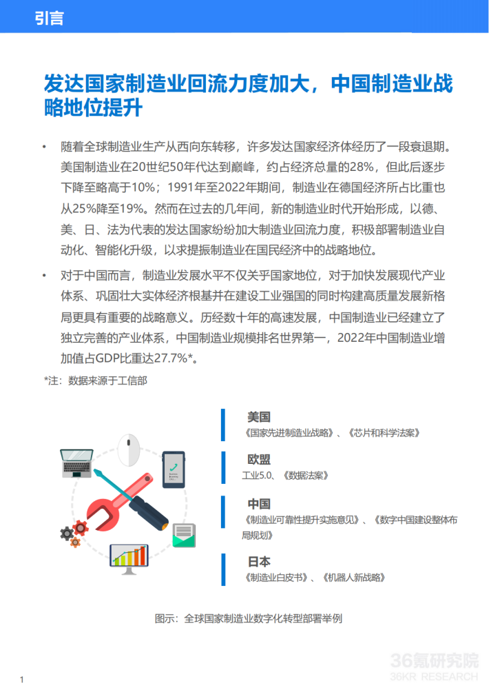 随着全球制造业生产从西向东转移,许多发达国家经济体经历了一段衰退期。美国制造业在20世纪50年代达到巅峰,约占经济总量的28%,但此后逐步下降至略高于10%;1991年至2022年期间,制造业在德国经济所占比重也从25%降至19%。然而在过去的几年间,新的制造业时代开始形成,以德、美、日、法为代表的发达国家纷纷加大制造业回流力度,积极部署制造业自动化、智能化升级,以求提振制造业在国民经济中的战略地位。