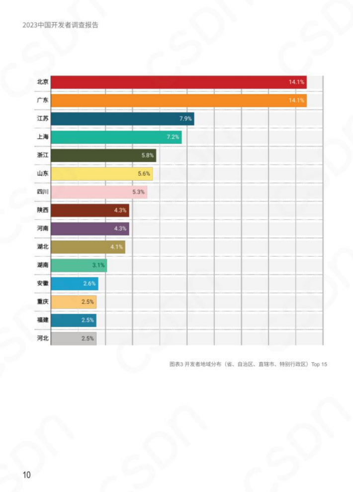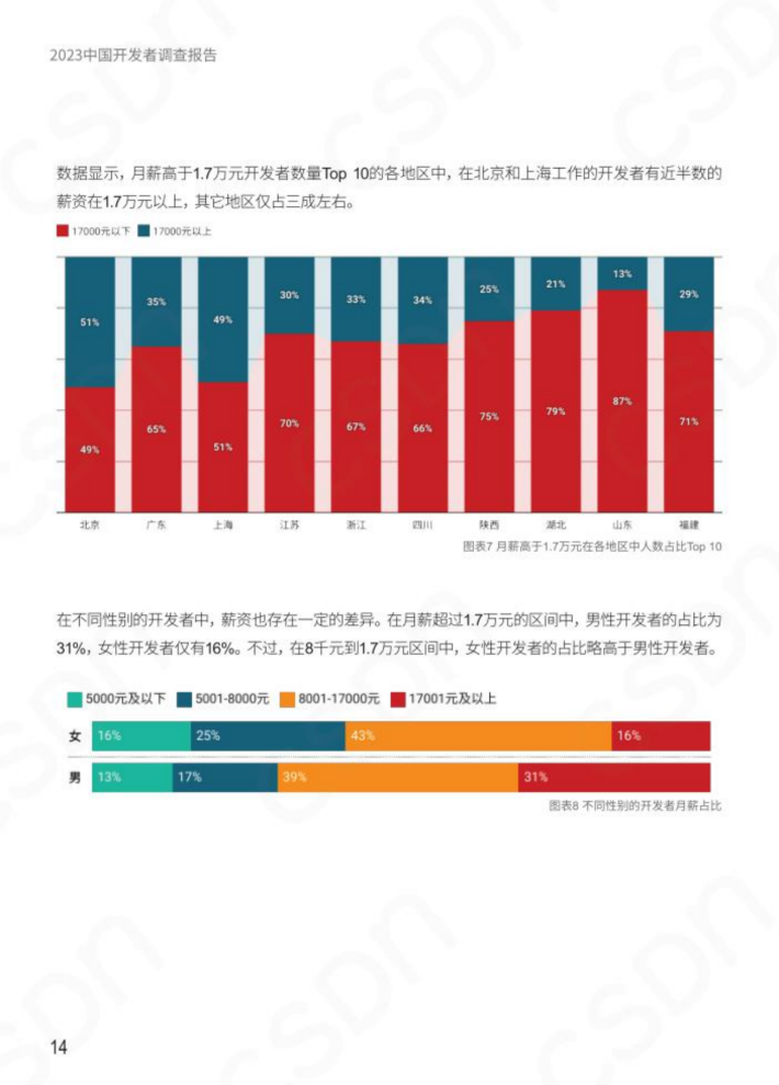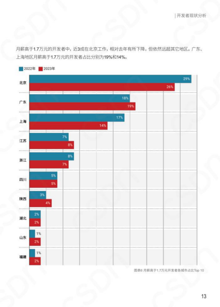 月薪高于1.7万元的开发者中,近3成在北京工作,相对去年有所下降,但依然远超其它地区。广东、上海地区月薪高于1.7万元的开发者占比分别为19%和14%。