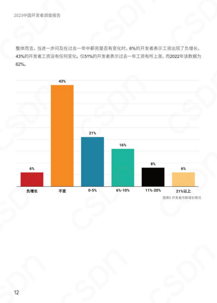 整体而言,当进一步问及在过去一年中薪资是否有变化时,6%的开发者表示工资出现了负增长,43%的开发者工资没有任何变化。仅51%的开发者表示过去一年工资有所上涨,而2022年该数据为62%。