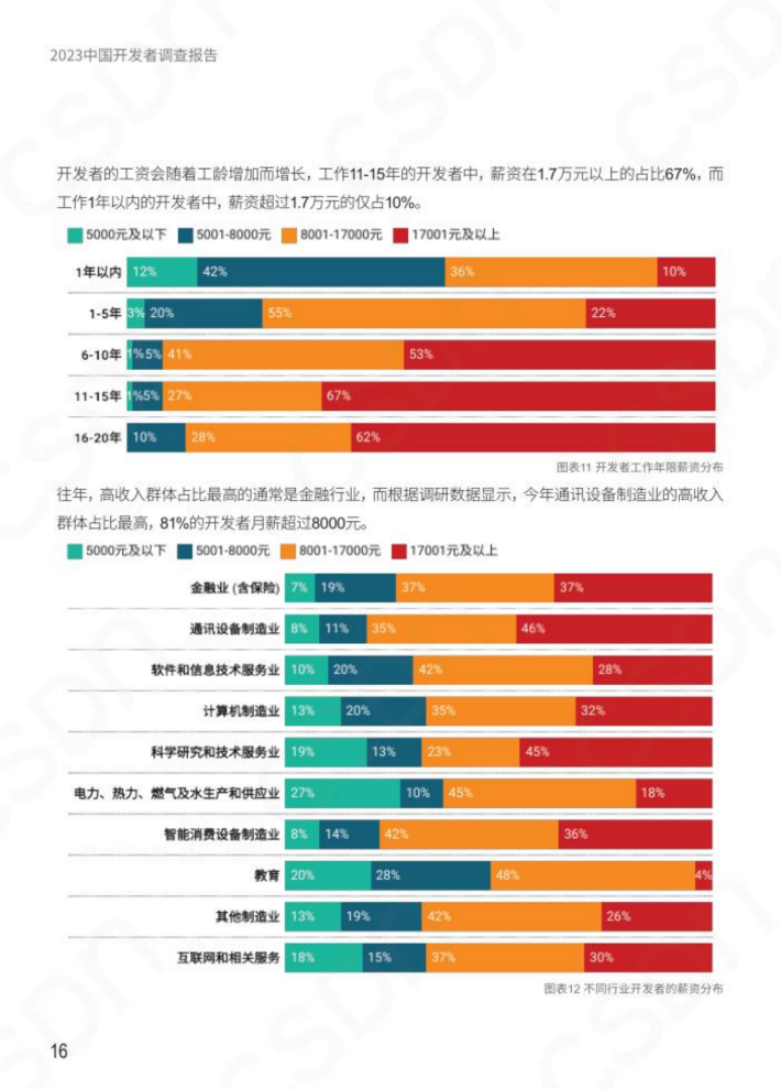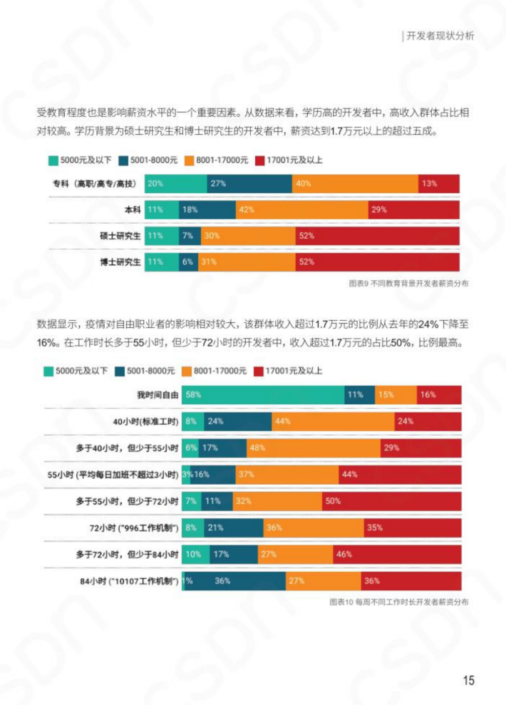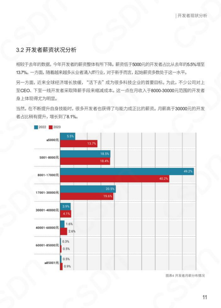当然,在不断提升自身技能时,很多开发者也获得了与能力成正比的薪资。月薪高于30000元的开发者占比稍有提升,增长到了8.1%。