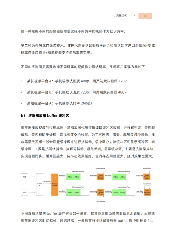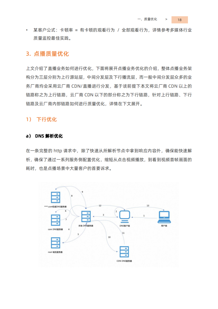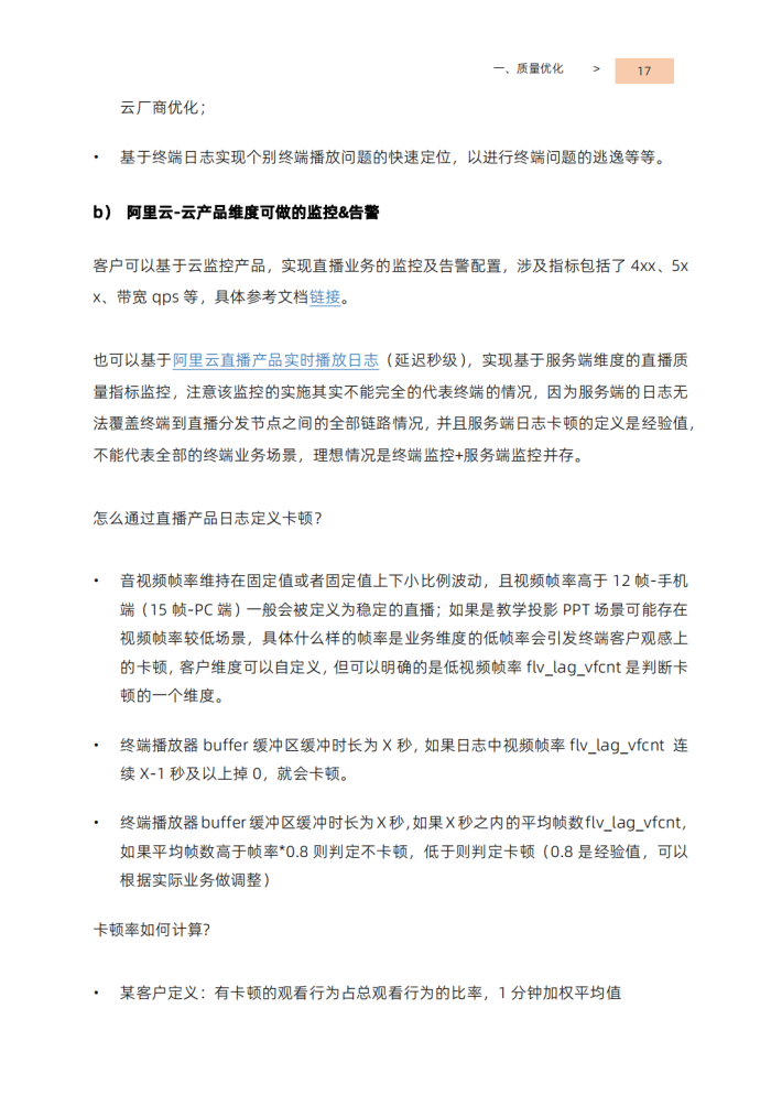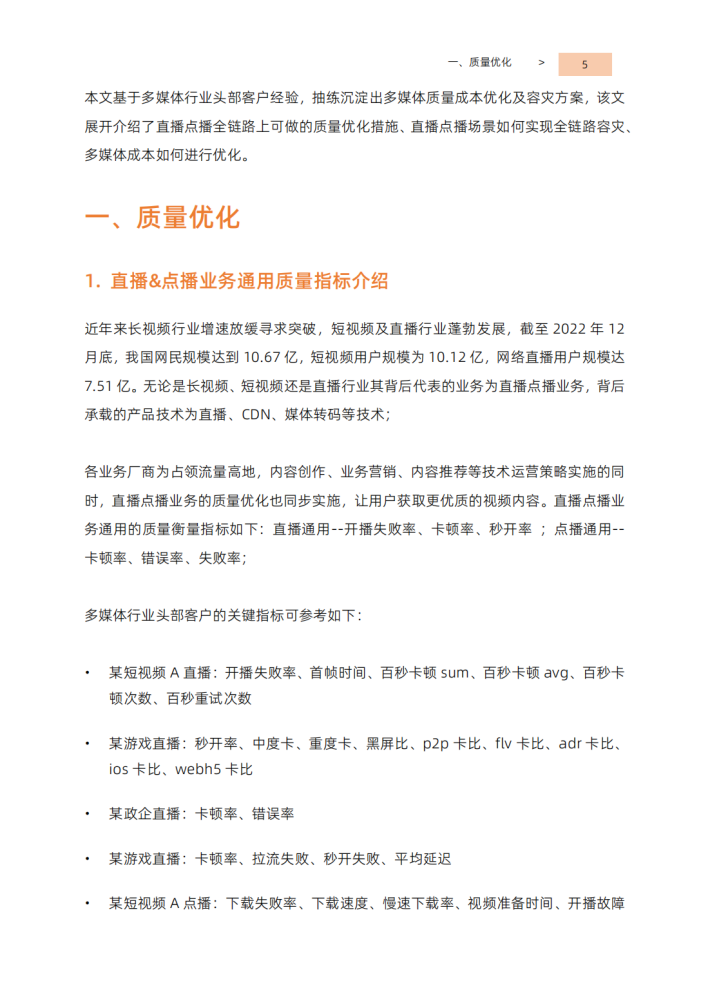 各业务厂商为占领流量高地,内容创作、业务营销、内容推荐等技术运营策略实施的同时,直播点播业务的质量优化也同步实施,让用户获取更优质的视频内容。直播点播业务通用的质量衡量指标如下:直播通用--开播失败率、卡顿率、秒开率;点播通用--卡顿率、错误率、失败率;