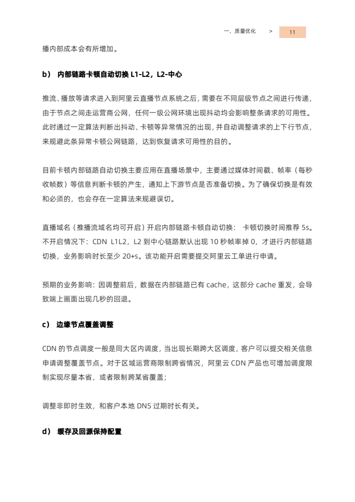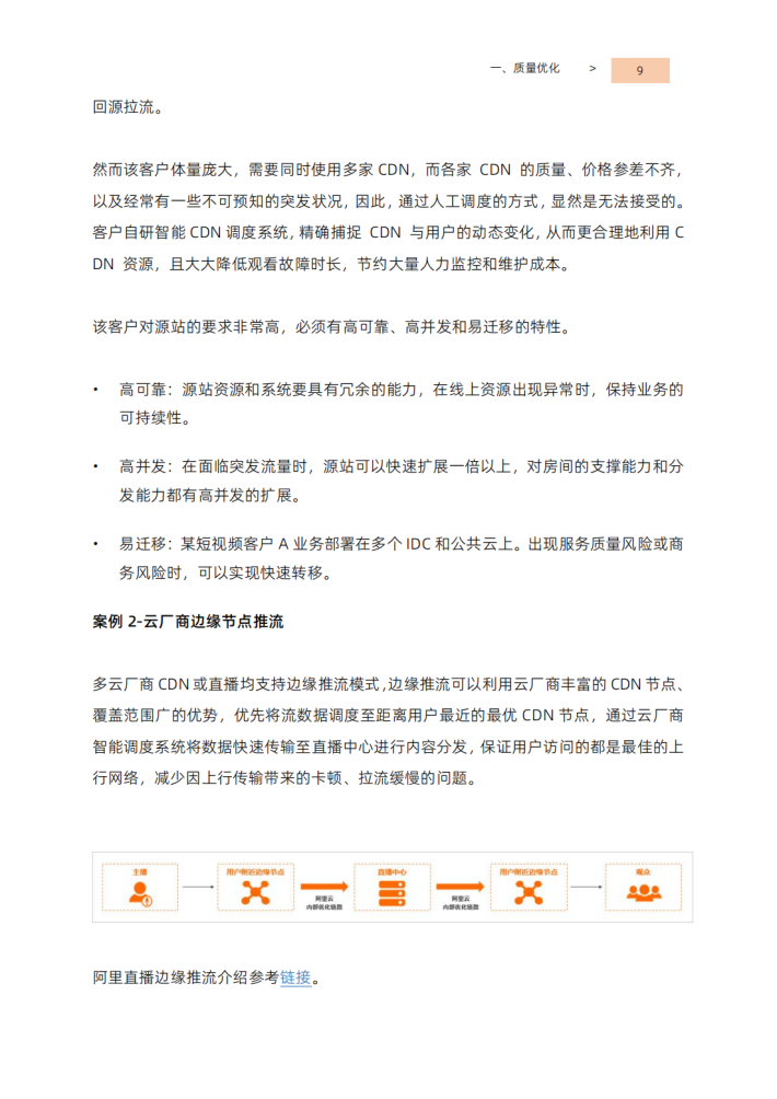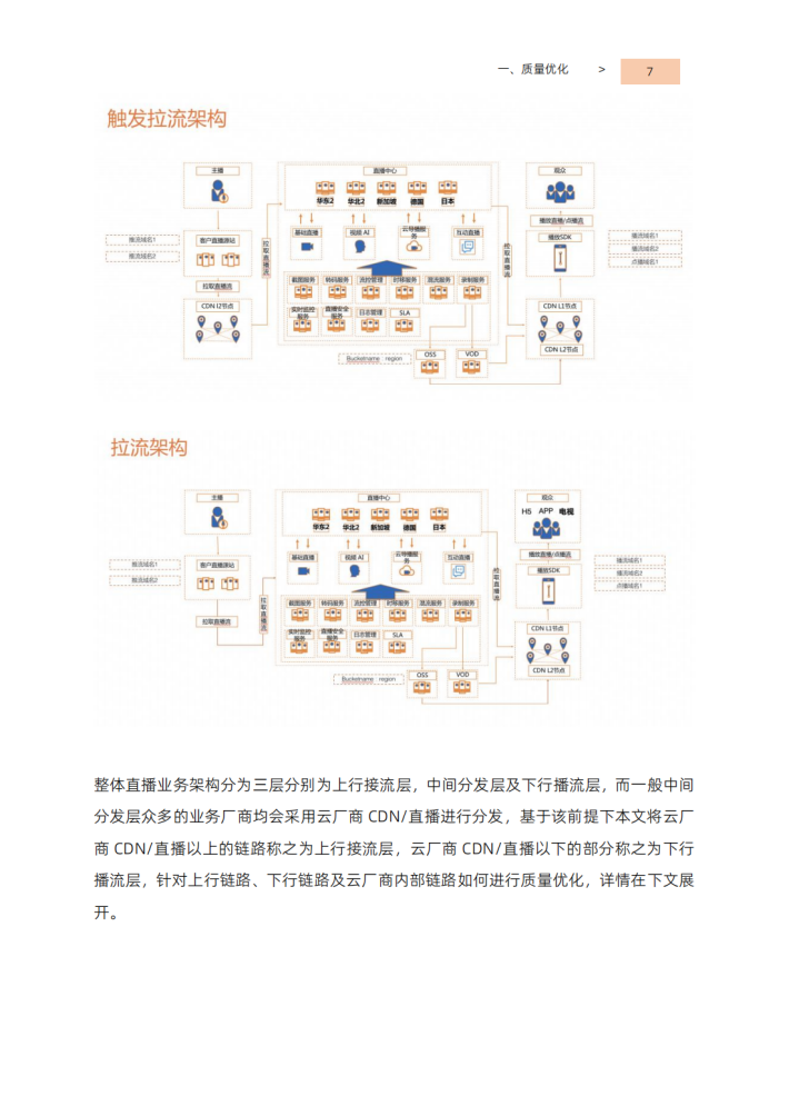 整体直播业务架构分为三层分别为上行接流层,中间分发层及下行播流层,而一般中间分发层众多的业务厂商均会采用云厂商CDN/直播进行分发,基于该前提下本文将云厂商CDN/直播以上的链路称之为上行接流层,云厂商CDN/直播以下的部分称之为下行播流层,针对上行链路、下行链路及云厂商内部链路如何进行质量优化,详情在下文展开。