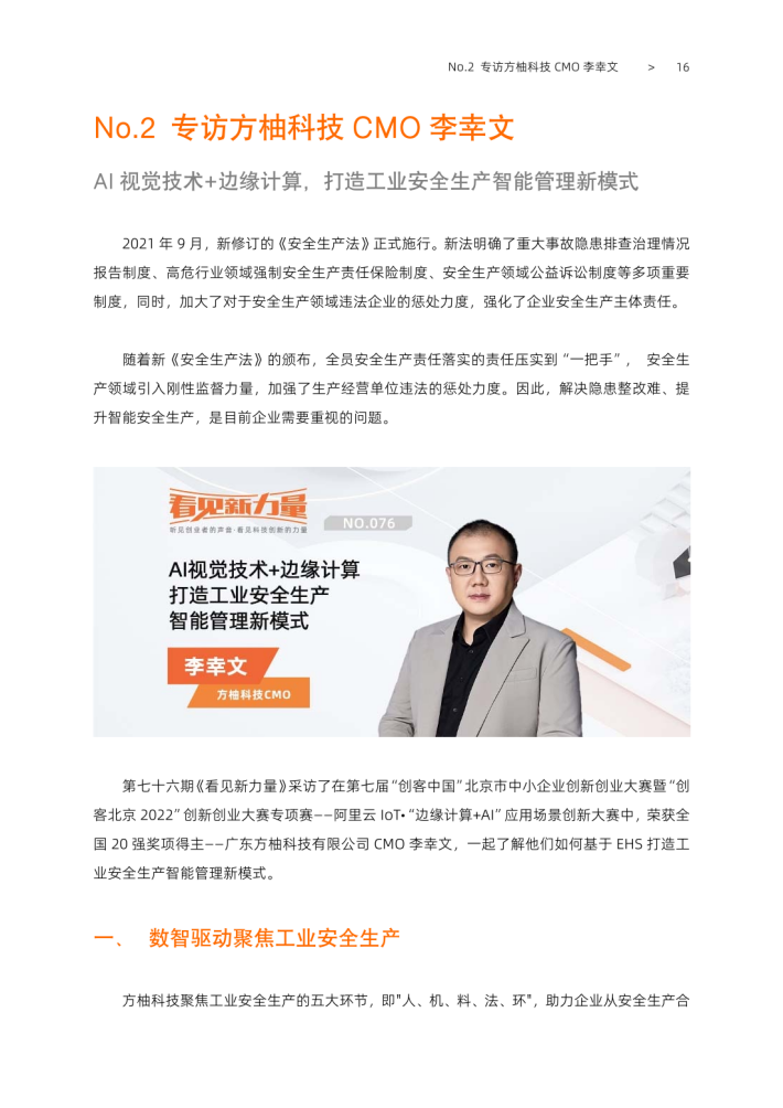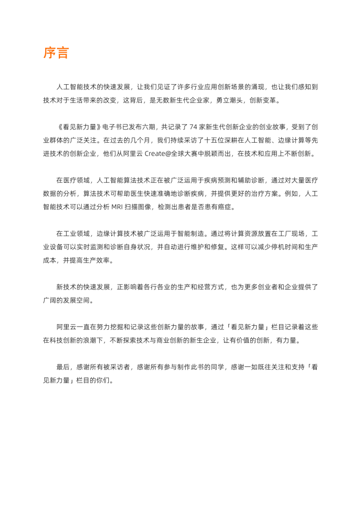 《看见新力量》电子书已发布六期,共记录了74家新生代创新企业的创业故事,受到了创业群体的广泛关注。在过去的几个月,我们持续采访了十五位深耕在人工智能、边缘计算等先进技术的创新企业,他们从阿里云Create@全球大赛中脱颖而出,在技术和应用上不断创新。