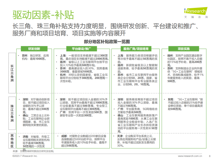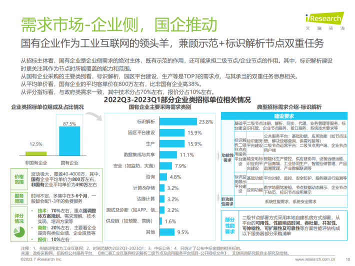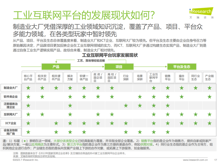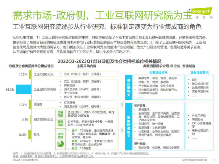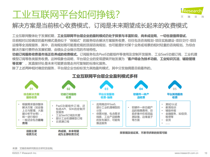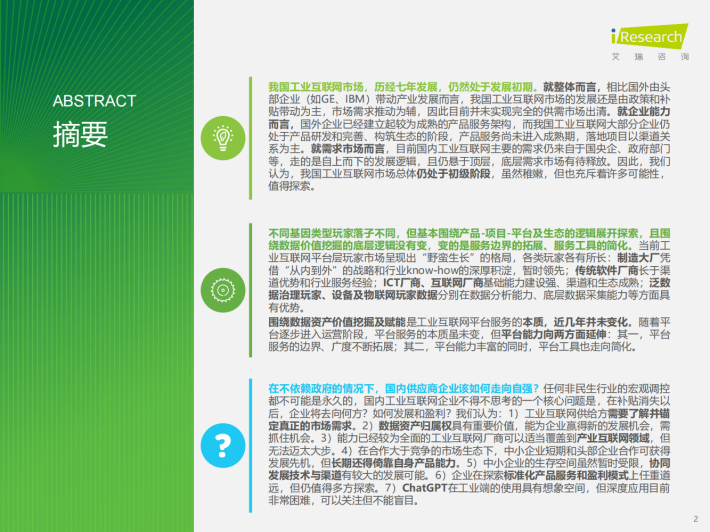 在不依赖政府的情况下,国内供应商企业该如何走向自强?任何非民生行业的宏观调控都不可能是永久的,国内工业互联网企业不得不思考的一个核心问题是,在补贴消失以后,企业将去向何方?如何发展和盈利?我们认为:1)工业互联网供给方需要了解并锚定真正的市场需求。2)数据资产归属权具有重要价值,能为企业赢得新的发展机会,需抓住机会。3)能力已经较为全面的工业互联网厂商可以适当覆盖到产业互联网领域,但无法迈太大步。4)在合作大于竞争的市场生态下,中小企业短期和头部企业合作可获得发展先机,但长期还得倚靠自身产品能力。5)中小企业的生存空间虽然暂时受限,协同发展技术与渠道有较大的发展可能。6)企业在探索标准化产品服务和盈利模式上任重道远,但仍值得多方探索。7)ChatGPT在工业端的使用具有想象空间,但深度应用目前非常困难,可以关注但不能盲目。