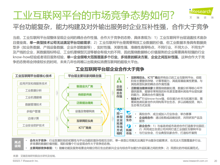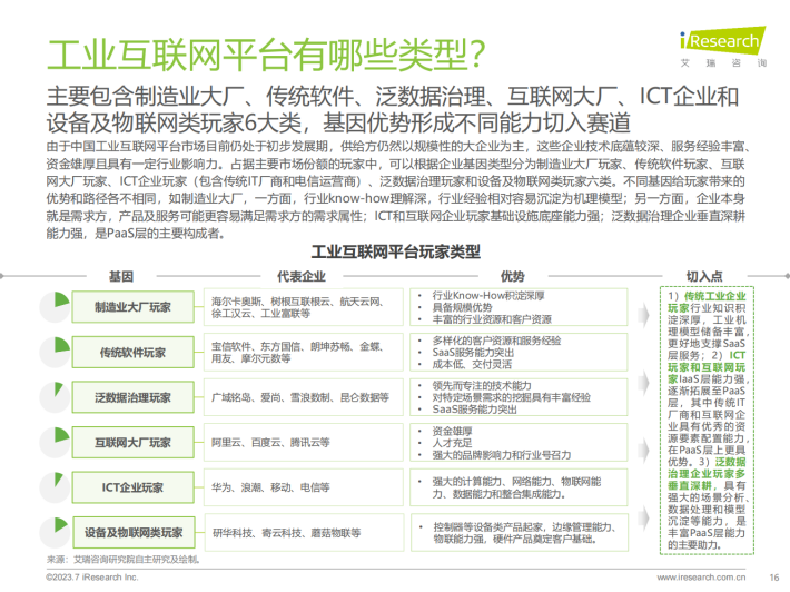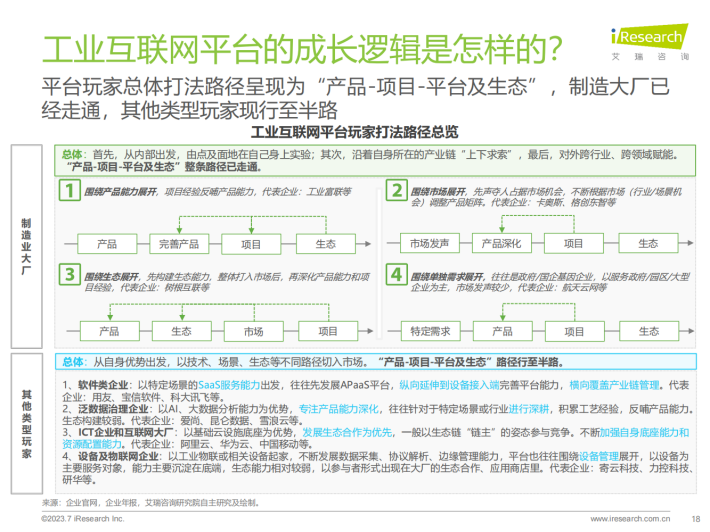 不同基因类型玩家落子不同,但基本围绕产品-项目-平台及生态的逻辑展开探索,且围绕数据价值挖掘的底层逻辑没有变,变的是服务边界的拓展、服务工具的简化。当前工业互联网平台层玩家市场呈现出“野蛮生长”的格局,各类玩家各有所长:制造大厂凭借“从内到外”的战略和行业know-how的深厚积淀,暂时领先;传统软件厂商长于渠道优势和行业服务经验;ICT厂商、互联网厂商基础能力建设强、渠道和生态成熟;泛数据治理玩家、设备及物联网玩家数据分别在数据分析能力、底层数据采集能力等方面具有优势。