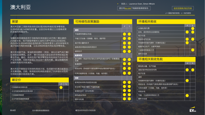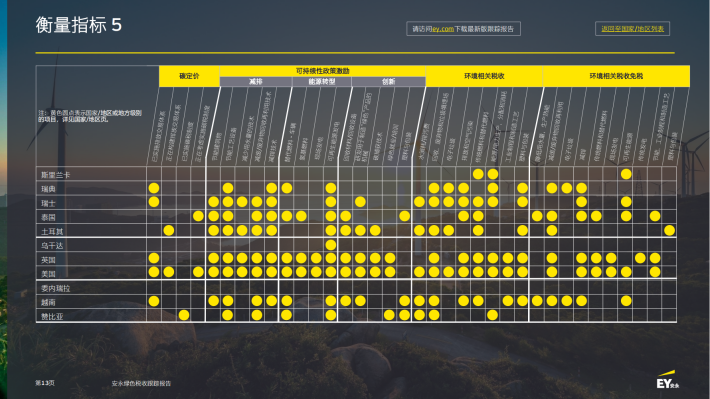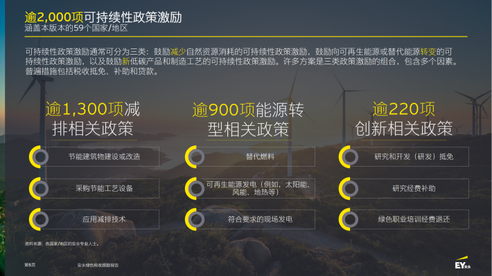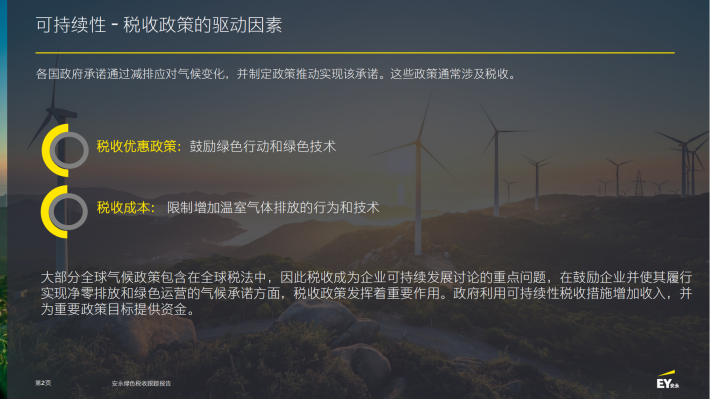 大部分全球气候政策包含在全球税法中,因此税收成为企业可持续发展讨论的重点问题,在鼓励企业并使其履行实现净零排放和绿色运营的气候承诺方面,税收政策发挥着重要作用。政府利用可持续性税收措施增加收入,并为重要政策目标提供资金。