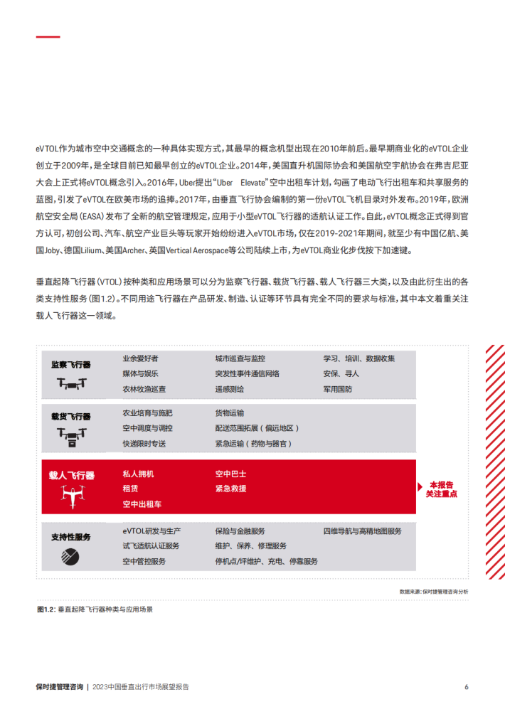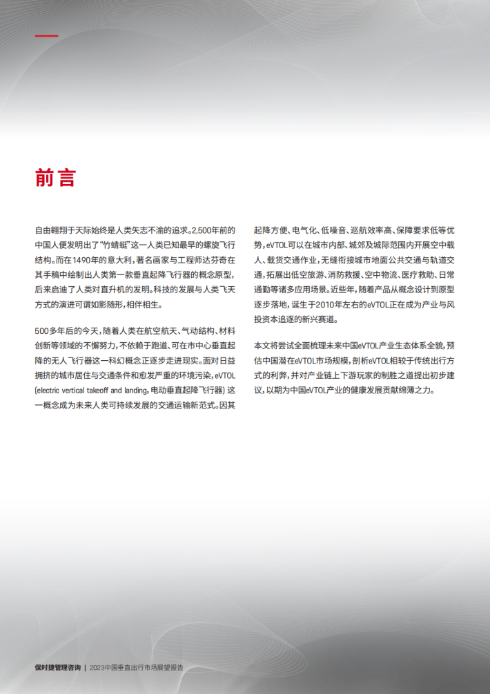 500多年后的今天,随着人类在航空航天、气动结构、材料创新等领域的不懈努力,不依赖于跑道、可在市中心垂直起降的无人飞行器这一科幻概念正逐步走进现实。面对日益拥挤的城市居住与交通条件和愈发严重的环境污染,eVTOL[electric vertical takeoff and landing,电动垂直起降飞行器]这一概念成为未来人类可持续发展的交通运输新范式。因其起降方便、电气化、低噪音、巡航效率高、保障要求低等优势,eVTOL可以在城市内部、城郊及城际范围内开展空中载人、载货交通作业,无缝衔接城市地面公共交通与轨道交通,拓展出低空旅游、消防救援、空中物流、医疗救助、日常通勤等诸多应用场景。近些年,随着产品从概念设计到原型逐步落地,诞生于2010年左右的eVTOL正在成为产业与风投资本追逐的新兴赛道。