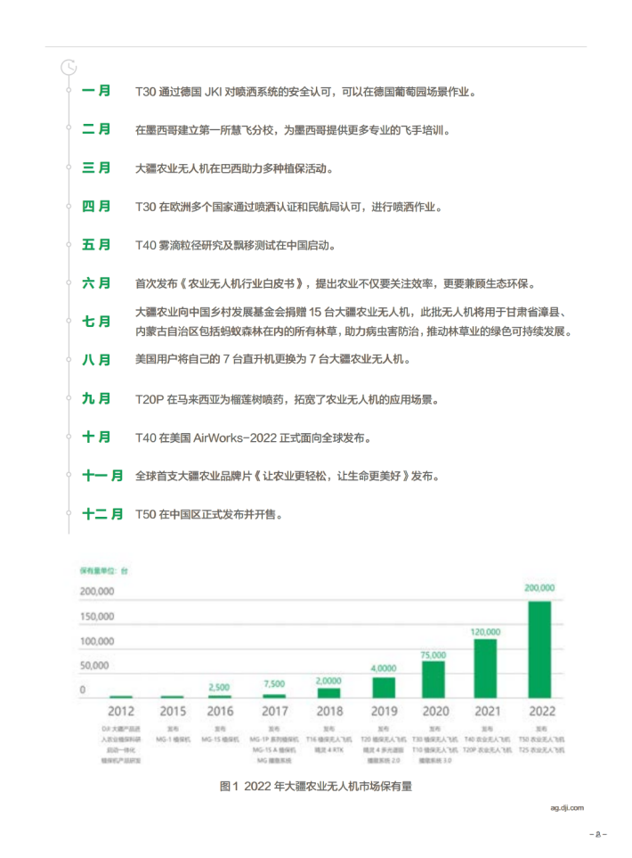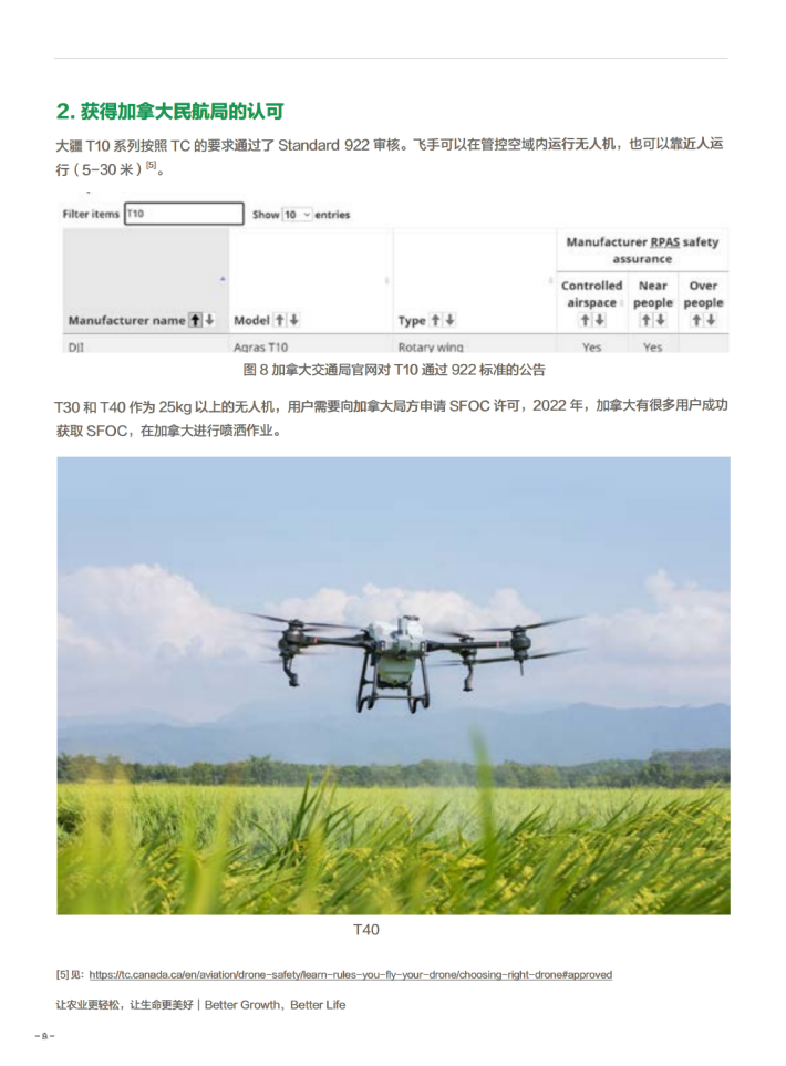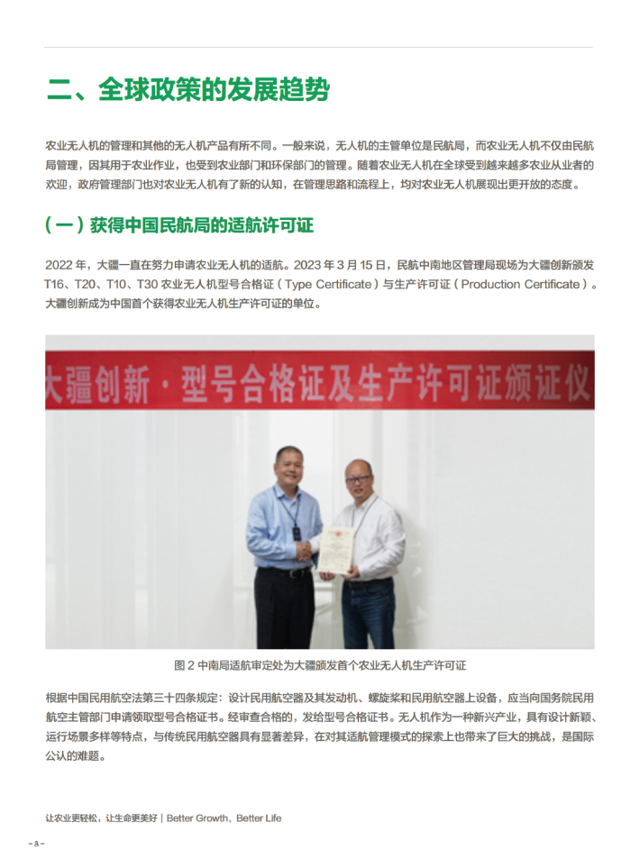 2022年12月,依据中国民用航空规章《民用航空产品和零部件合格审定规定》(CCAR-21),民航局正式发布《民用无人驾驶航空器系统适航审定管理程序》(AP-21-AA-2022-71)。根据该程序要求,中型农用无人驾驶航空器系统可按对限用类民用无人驾驶航空器系统的要求进行型号合格审定、生产许可审定和适航合格审定,通过取得型号合格证及其更改和补充型号合格证获得设计批准,通过取得生产许可证获得生产批准,通过取得民用无人驾驶航空器特殊适航证获得适航批准。大疆创新积极按照规章和程序要求开展证件转换和申请工作。民航中南地区管理局完成大疆创新四个型号证件的转换和申请审查后,分别于:2023年1月31日,签发大疆T16、T20两款农业无人机型号合格证;2月10日,签发大疆T10、T30两款农业无人机型号合格证;2月22日,签发大疆T16、T20、T10、T30的生产许可证。