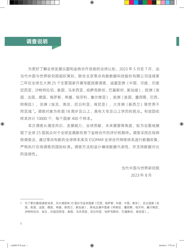 为更好了解全球发展议题和金砖合作效能的全球认知,2023年5月至7月,由当代中国与世界研究院组织策划,联合北京零点有数数据科技股份有限公司连续第二年在全球五大洲25个主要国家开展专题民意调查,涵盖亚洲(中国、印度、印度尼西亚、沙特阿拉伯、泰国、马来西亚、哈萨克斯坦、巴基斯坦、新加坡),欧洲(英国、法国、德国、俄罗斯、希腊、匈牙利、塞尔维亚),美洲(美国、墨西哥、巴西、阿根廷),非洲(埃及、南非、尼日利亚、肯尼亚),大洋洲(新西兰)等世界不同区域。调查对象为各国18周岁及以上、具有大专及以上学历的民众。有效回收样本共计10000个,每个国家400个样本。