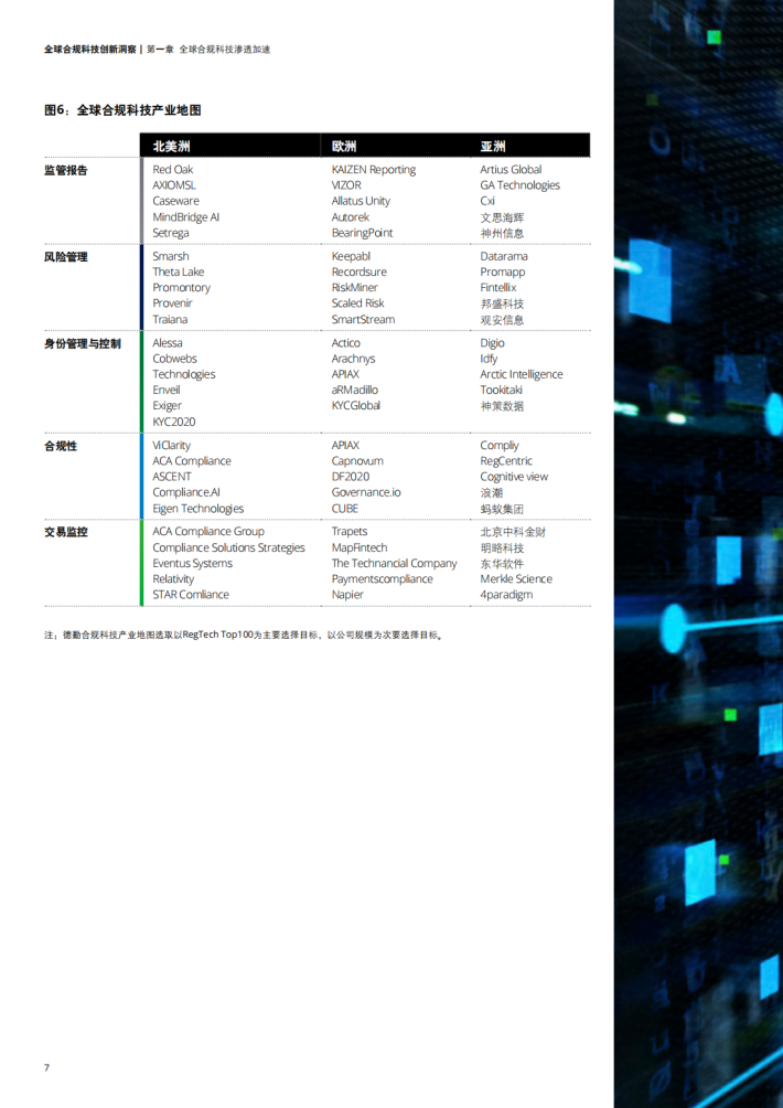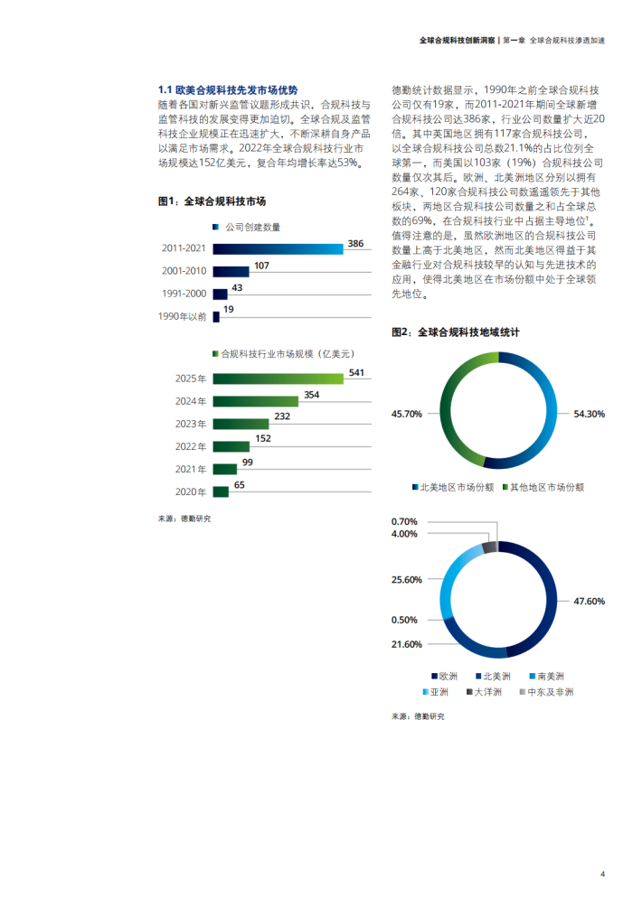 德勤统计数据显示,1990年之前全球合规科技公司仅有19家,而2011-2021年期间全球新增合规科技公司达386家,行业公司数量扩大近20倍。其中英国地区拥有117家合规科技公司,以全球合规科技公司总数21.1%的占比位列全球第一,而美国以103家(19%)合规科技公司数量仅次其后。欧洲、北美洲地区分别以拥有264家、120家合规科技公司数遥遥领先于其他板块,两地区合规科技公司数量之和占全球总数的69%,在合规科技行业中占据主导地位1。值得注意的是,虽然欧洲地区的合规科技公司数量上高于北美地区,然而北美地区得益于其金融行业对合规科技较早的认知与先进技术的应用,使得北美地区在市场份额中处于全球领先地位。