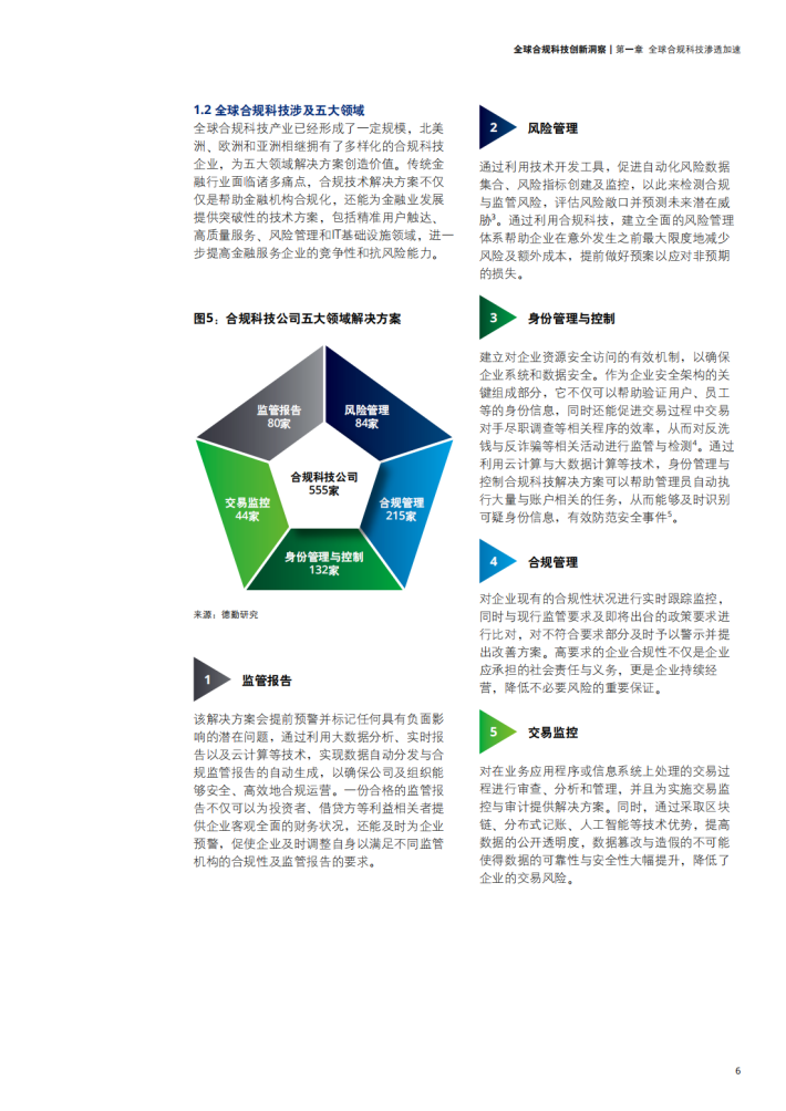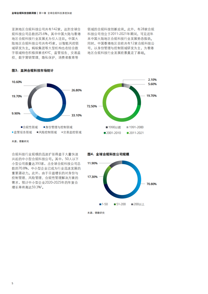 亚洲地区合规科技公司共有142家,达到全球合规科技公司总数的25.6%,其中中国大陆与香港地区合规科技行业发展尤为引人注目。中国大陆地区合规科技公司共有45家,以智能风控领域研发为主。蚂蚁集团等大型机构也在结合数字领域特色积极探索在KYC、监管报告、交易监控、数字营销管理、隐私保护、消费者教育等