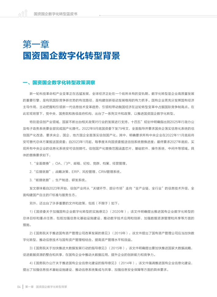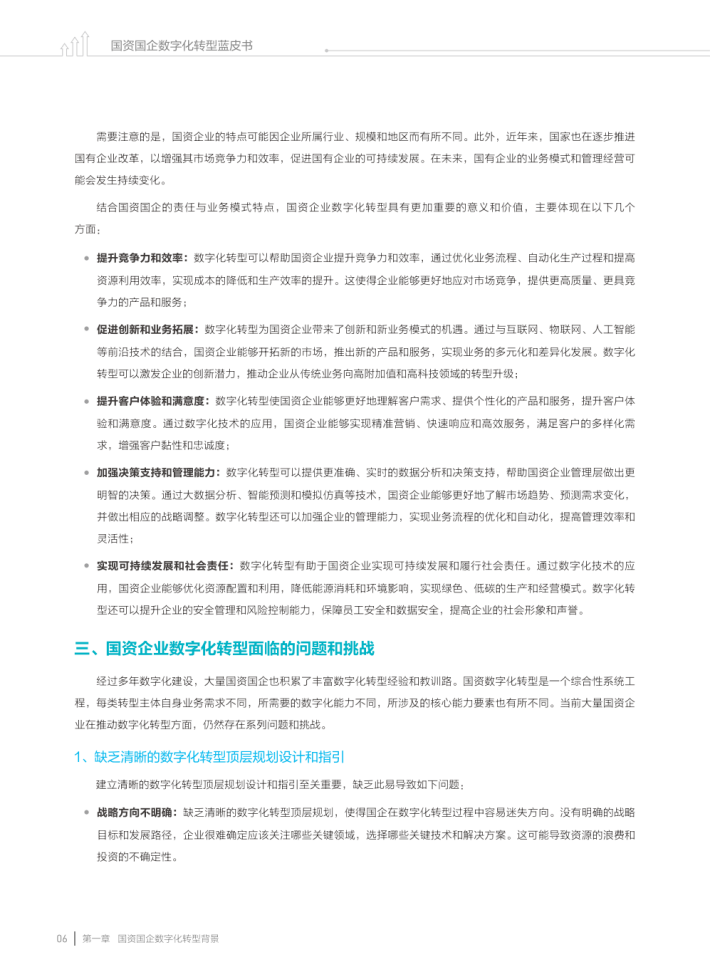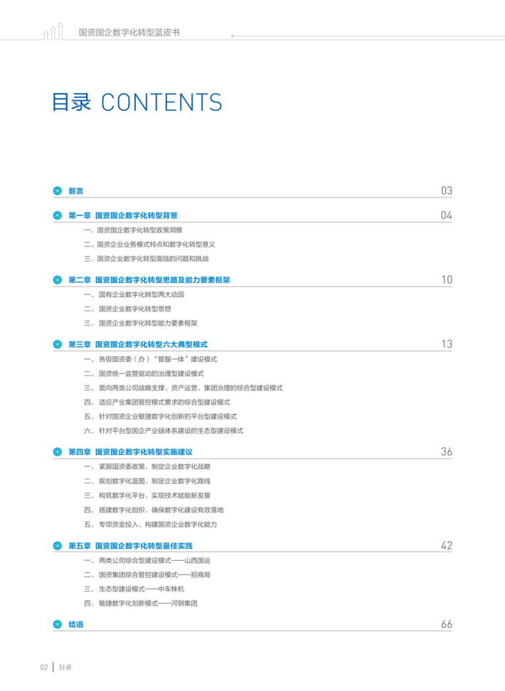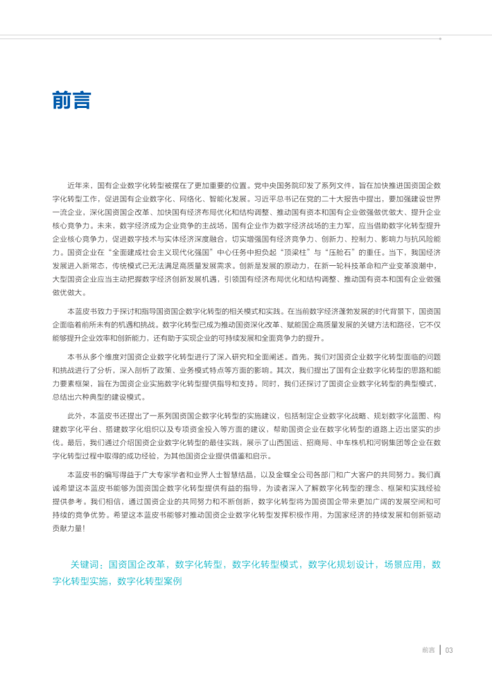 本蓝皮书致力于探讨和指导国资国企数字化转型的相关模式和实践。在当前数字经济蓬勃发展的时代背景下,国资国企面临着前所未有的机遇和挑战。数字化转型已成为推动国资深化改革、赋能国企高质量发展的关键方法和路径,它不仅能够提升企业效率和创新能力,还有助于实现企业的可持续发展和全面竞争力的提升。