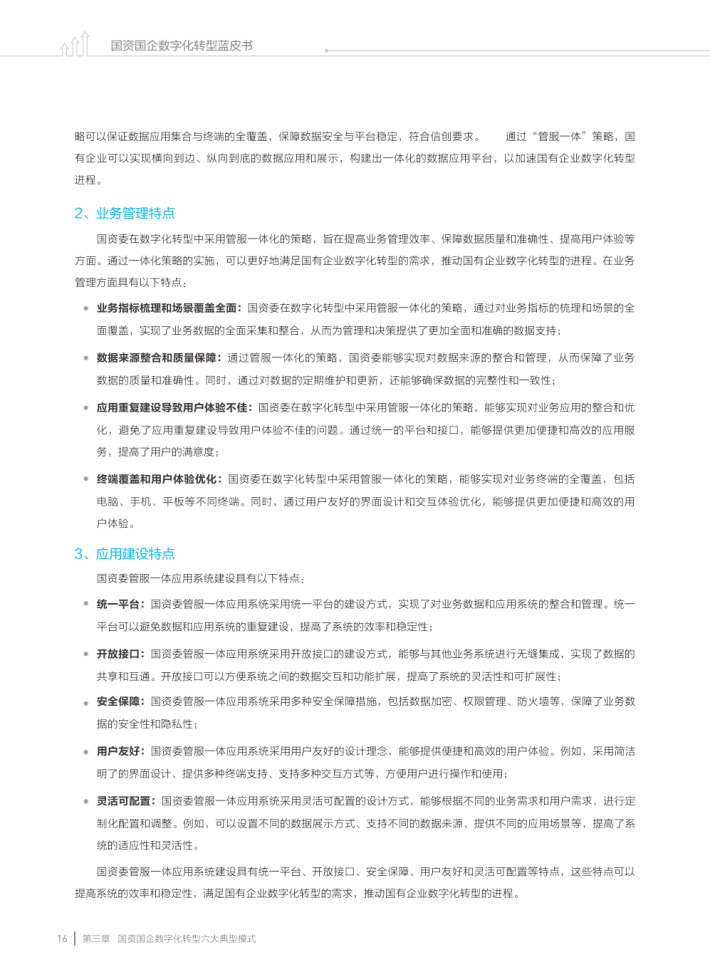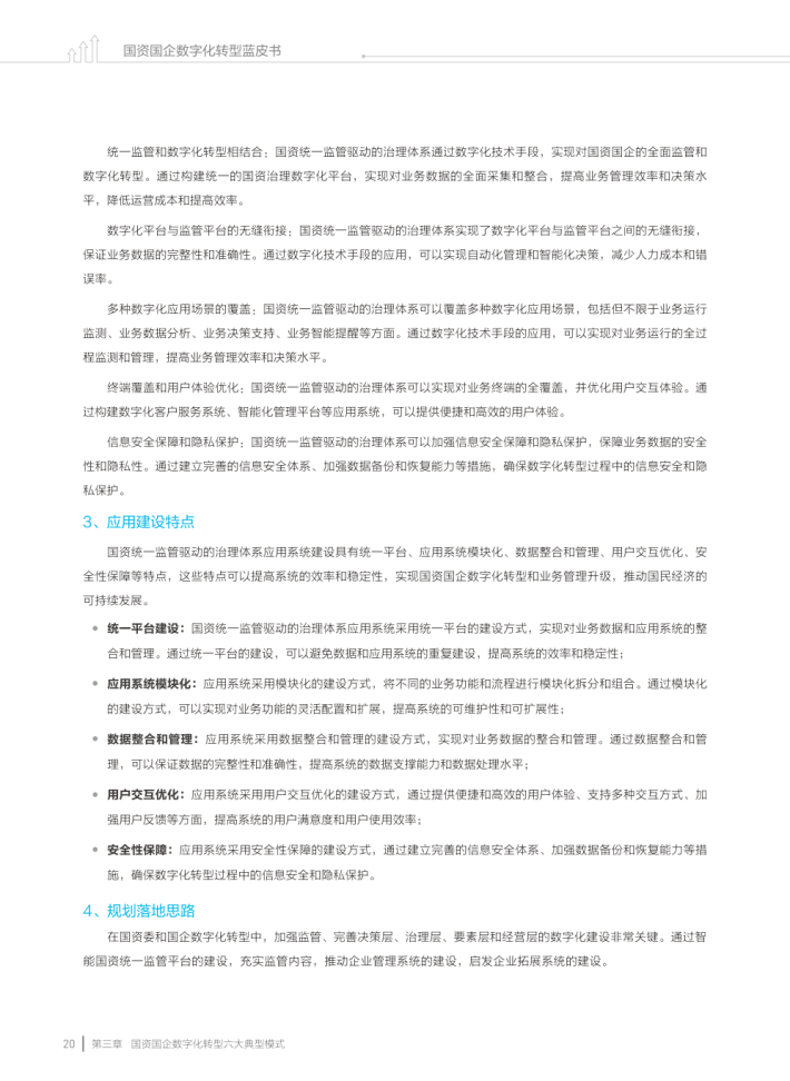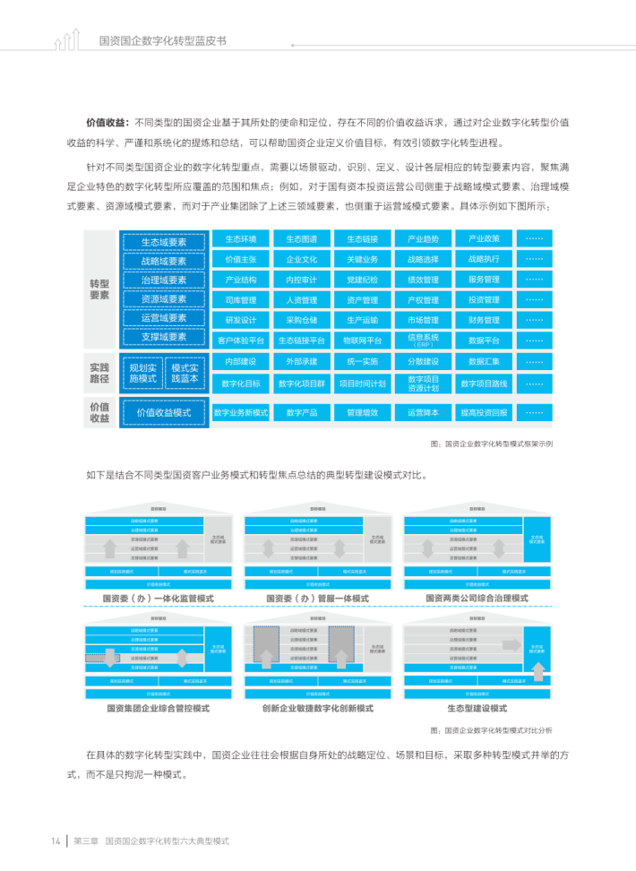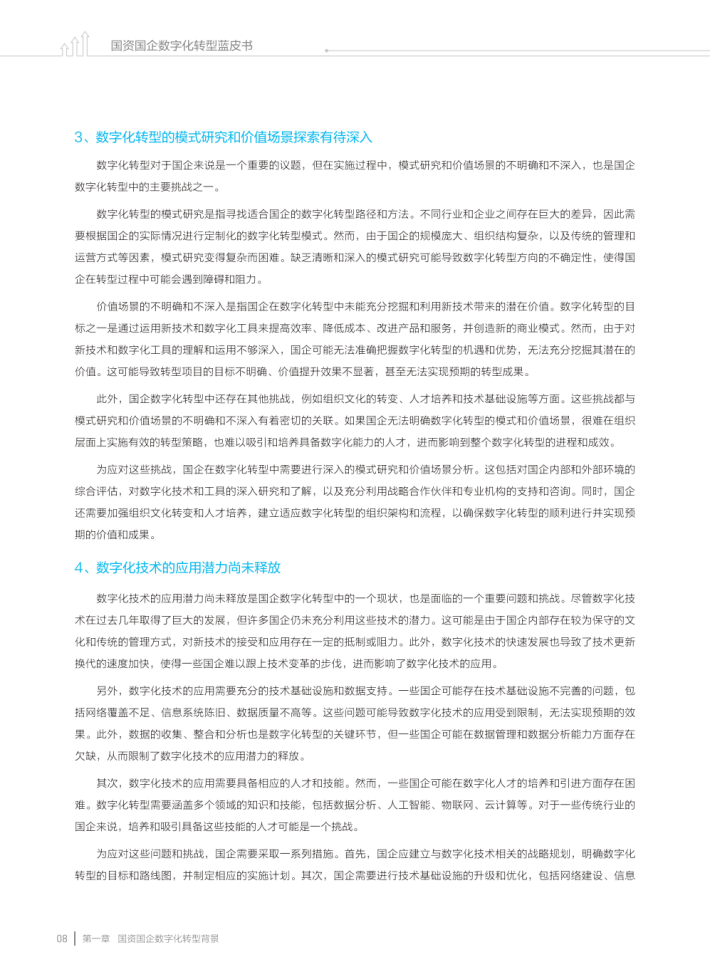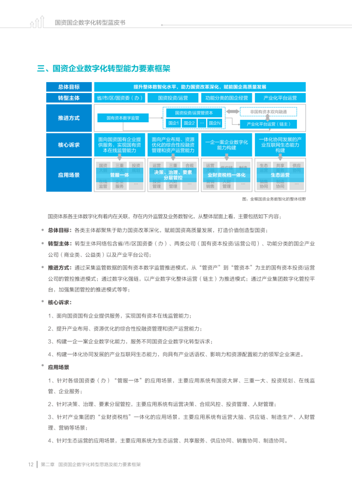 此外,本蓝皮书还提出了一系列国资国企数字化转型的实施建议,包括制定企业数字化战略、规划数字化蓝图、构建数字化平台、搭建数字化组织以及专项资金投入等方面的建议,帮助国资企业在数字化转型的道路上迈出坚实的步伐。最后,我们通过介绍国资企业数字化转型的最佳实践,展示了山西国运、招商局、中车株机和河钢集团等企业在数字化转型过程中取得的成功经验,为其他国资企业提供借鉴和启示。