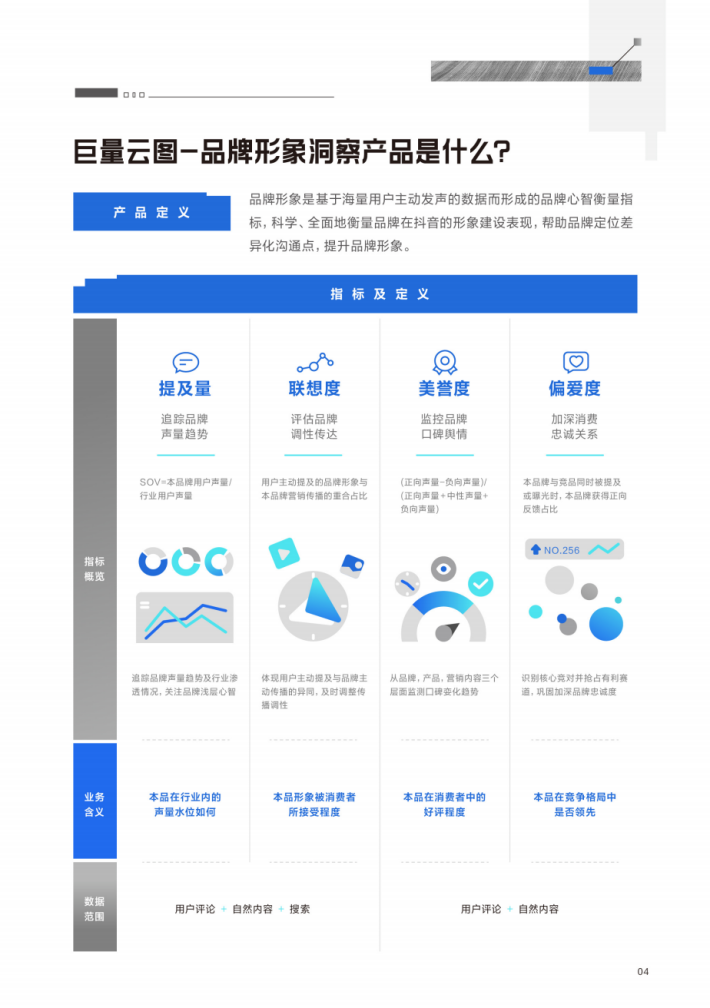 品牌形象是基于海量用户主动发声的数据而形成的品牌心智衡量指标,科学、全面地衡量品牌在抖音的形象建设表现,帮助品牌定位差异化沟通点,提升品牌形象。