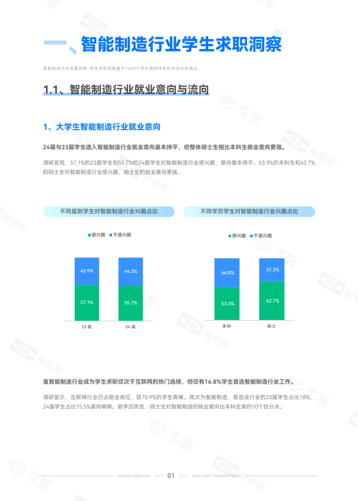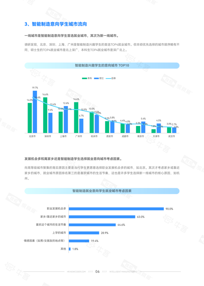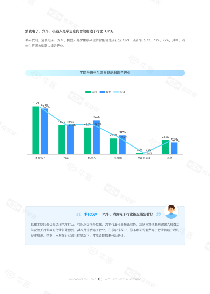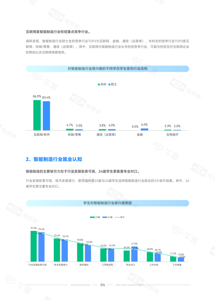 24届学生占比15.5%意向稍降。就学历而言,硕士生对智能制造的就业意向比本科生高约10个百分点。