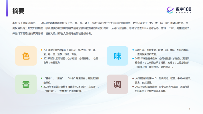 人们对事物的综合感受主要来自于事物对人的眼、耳、口、鼻、舌、身、心、意的刺激,从而构成了视觉体验、嗅觉体验、味觉体验、听觉体验、触觉体验、感觉体验等。因此,设计符合人群偏好的体验,需要对人们的各类体验偏好进行解构研究。同时,随着个体及环境的变化,人们的各类体验偏好也随之发生变迁,因此也需要对人们的视觉体验、嗅觉体验、味觉体验、听觉体验、触觉体验、感觉体验等偏好进行趋势性的预测,从而前瞻性的指导相关产品和服务的体验设计。