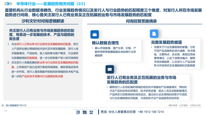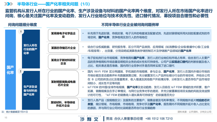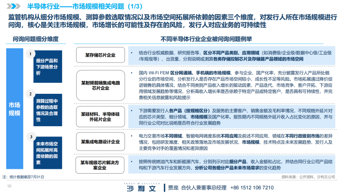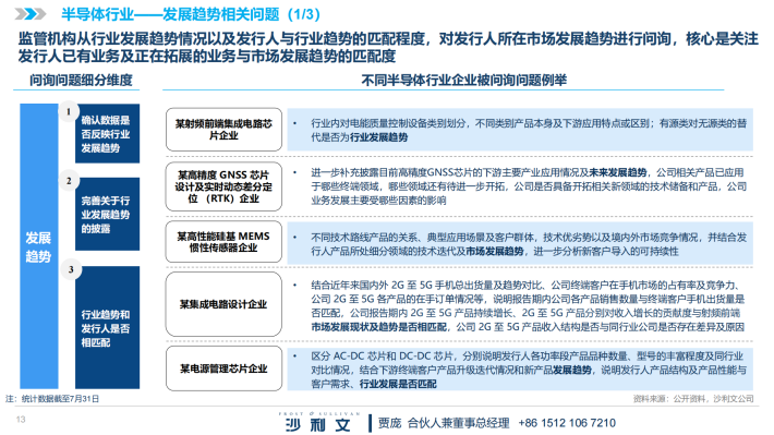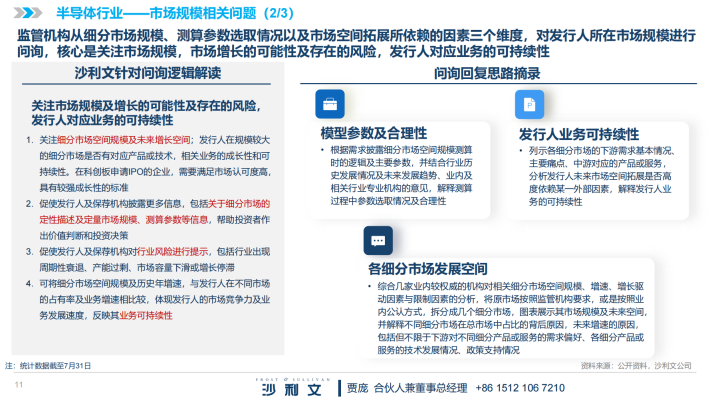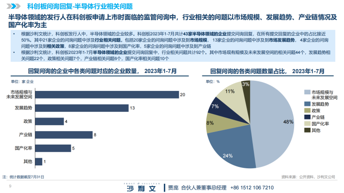 根据沙利文统计,科创板2023年1-7月行业相关问题共计360个,其中市场现有规模及未来发展空间的相关问题204个,发展趋势相关问题59个,政策相关问题50个,产业链相关问题14个,国产化率相关问题30个