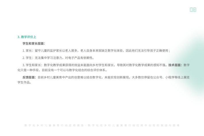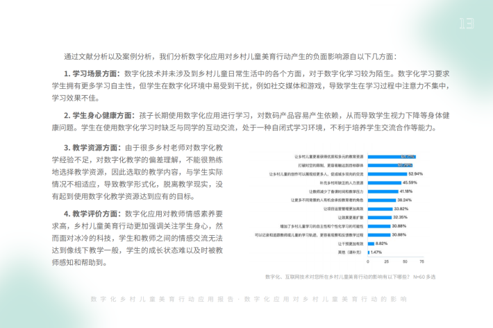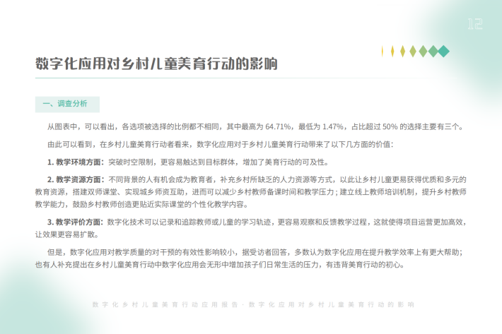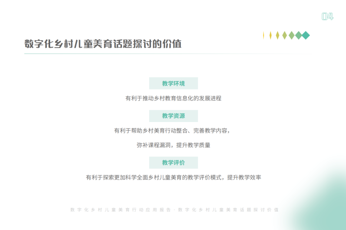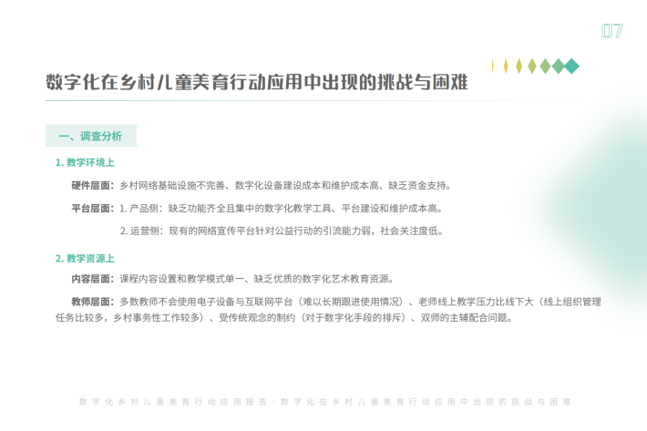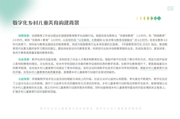 社会背景:数字化技术迅猛发展,深刻改变了社会人才需求和教育形态。智能环境不仅改变了教与学的方式,而且已经开始深入影响到教育的理念、文化和生态。但乡村学校因缺乏完善的教学设施和优质的教学资源,在数字化教育提升下,更是面临着巨大的教学困境,这也给乡村儿童美育行动提出了更多的挑战,如何主动利用数字化技术打破乡村学校的困境,赋能乡村儿童美育行动的开展,实现乡村儿童教育的高质量发展,是需要乡村儿童美育行动者们去尝试突破的。