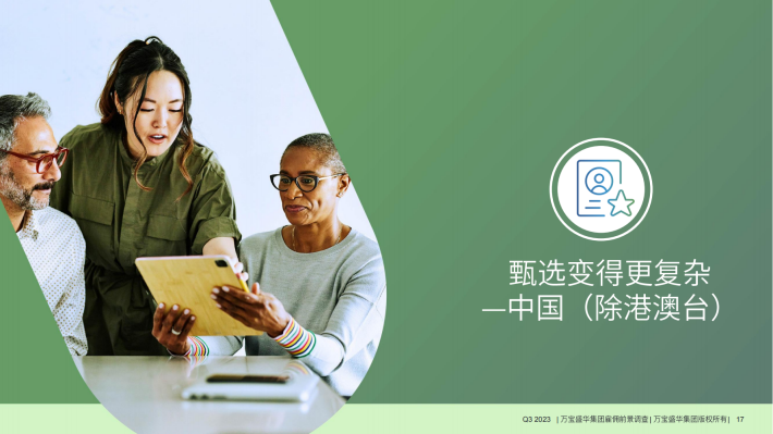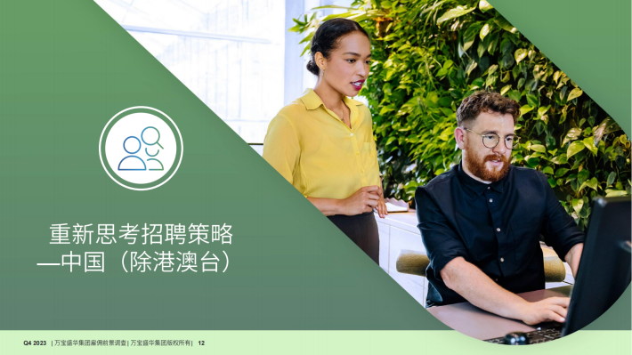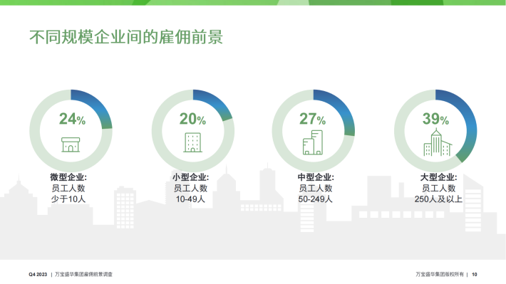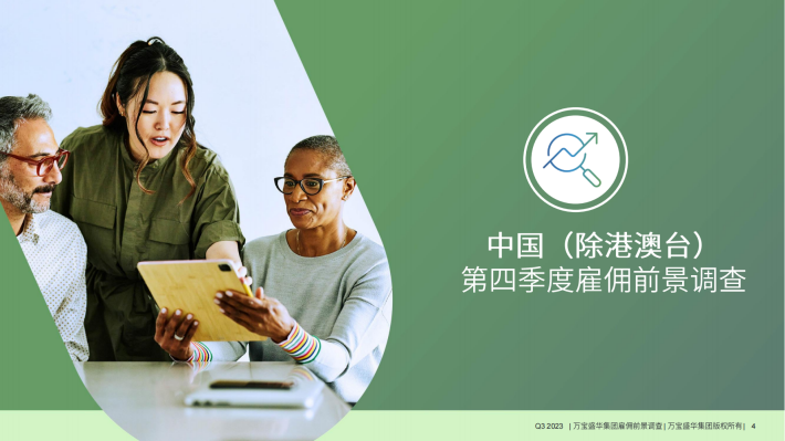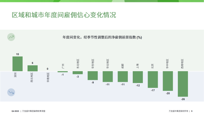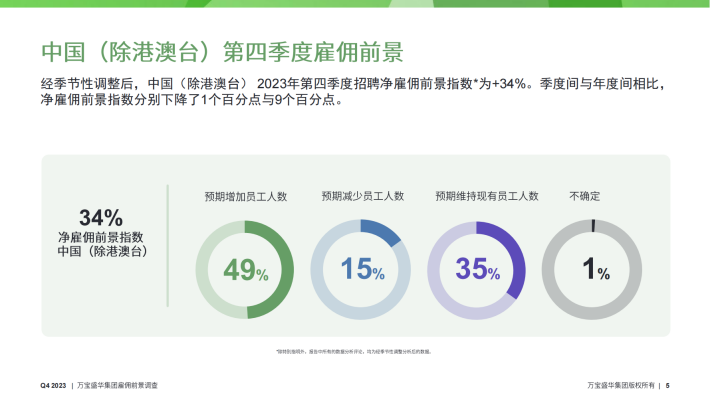 经季节性调整后,中国(除港澳台)2023年第四季度招聘净雇佣前景指数*为+34%。季度间与年度间相比,净雇佣前景指数分别下降了1个百分点与9个百分点。