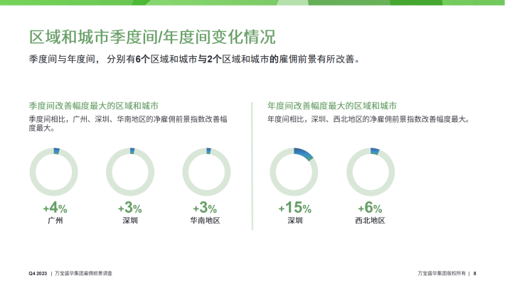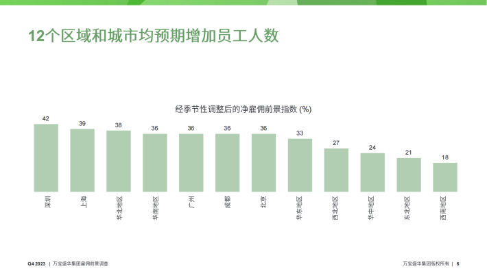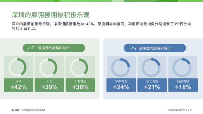 深圳的雇佣前景最乐观,净雇佣前景指数为+42%,季度间与年度间,净雇佣前景指数分别增长了3个百分点与15个百分点。