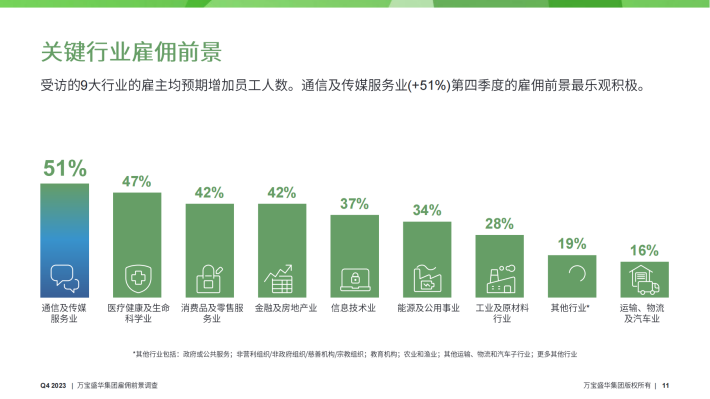 受访的9大行业的雇主均预期增加员工人数。通信及传媒服务业(+51%)第四季度的雇佣前景最乐观积极。