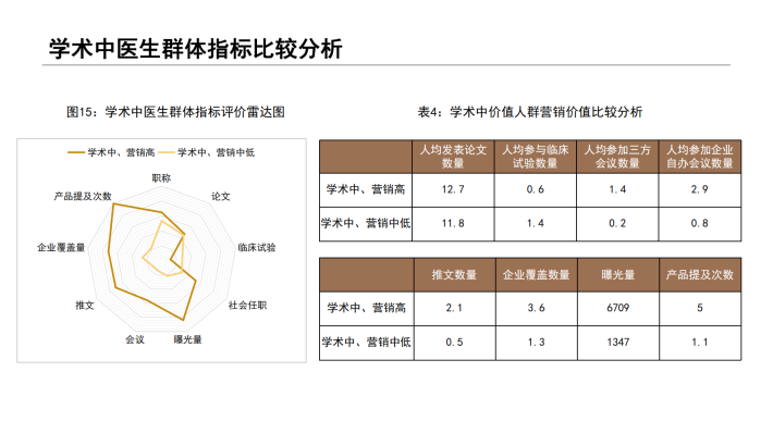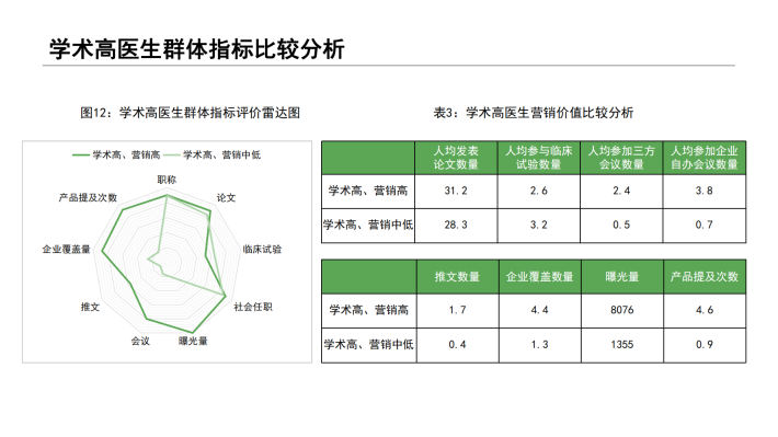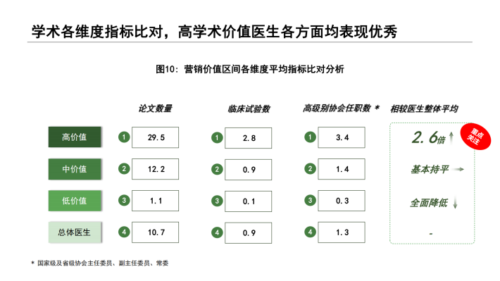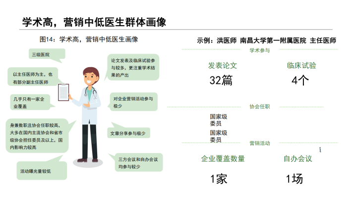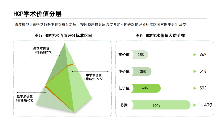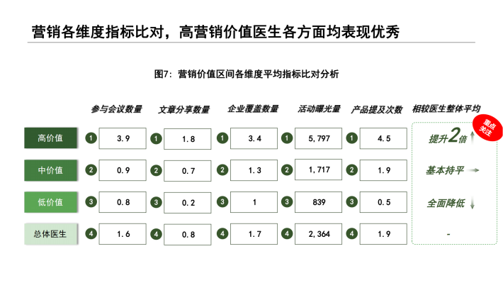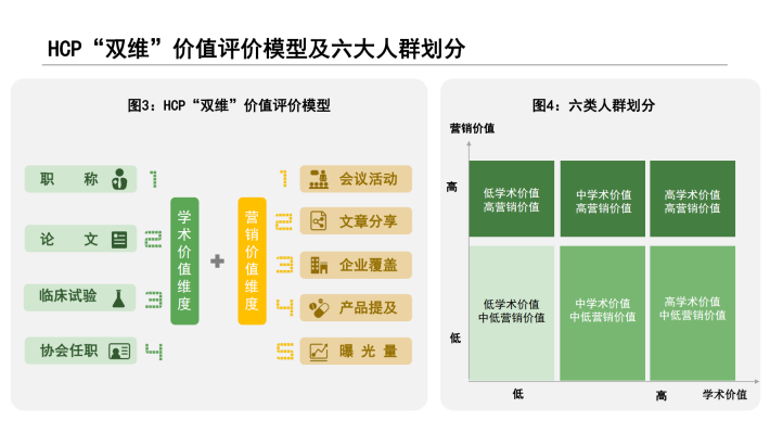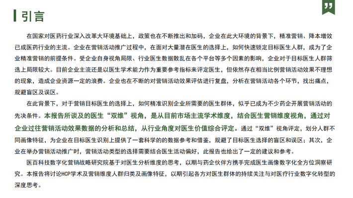 在此背景下,对于营销目标医生的选择上,如何精准识别企业所需要的医生群体,似乎已成为不少药企开展营销活动的先决条件。本报告所谈及的医生“双维”视角,是从目前市场主流学术维度,结合医生营销维度视角,通过对企业过往营销活动效果数据的分析和总结,从行业角度对医生价值综合评定。通过“双维”视角评定,划分人群不同画像特征,为企业在目标医生识别上提供了一套科学的的数据参考和借鉴,规避了目标医生选择的盲区和误区;其次,企业在举办营销活动推广时,营销活动类型的选择需要结合医生活动偏好,此报告也给出了一定的建议和参考。