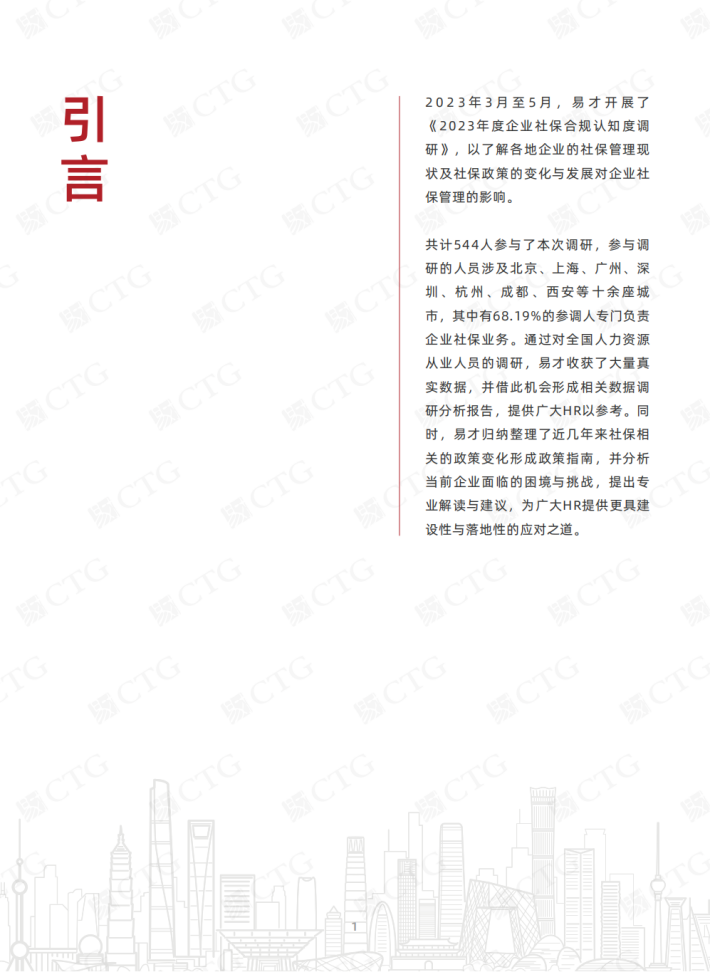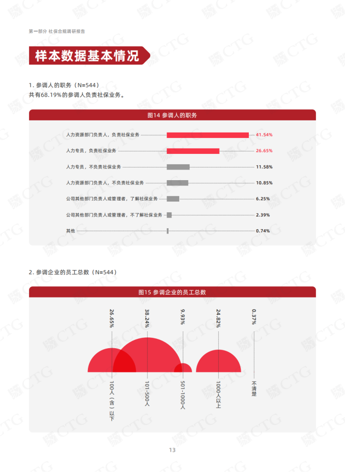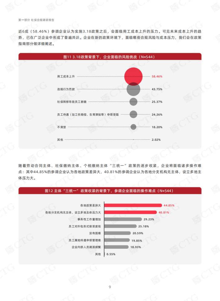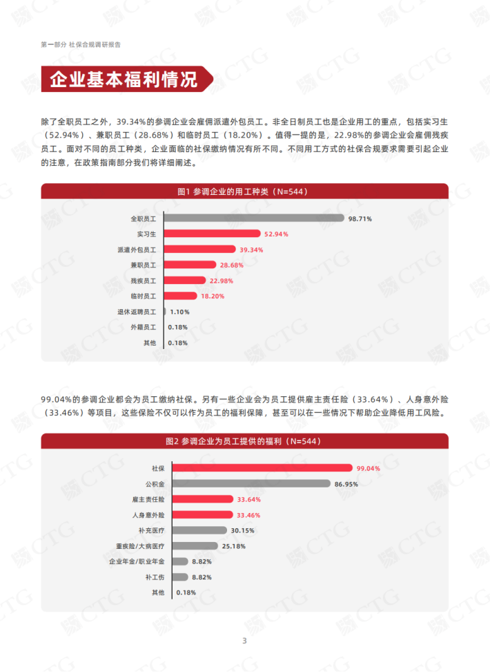 除了全职员工之外,39.34%的参调企业会雇佣派遣外包员工。非全日制员工也是企业用工的重点,包括实习生(52.94%)、兼职员工(28.68%)和临时员工(18.20%)。值得一提的是,22.98%的参调企业会雇佣残疾员工。面对不同的员工种类,企业面临的社保缴纳情况有所不同。不同用工方式的社保合规要求需要引起企业的注意,在政策指南部分我们将详细阐述。
