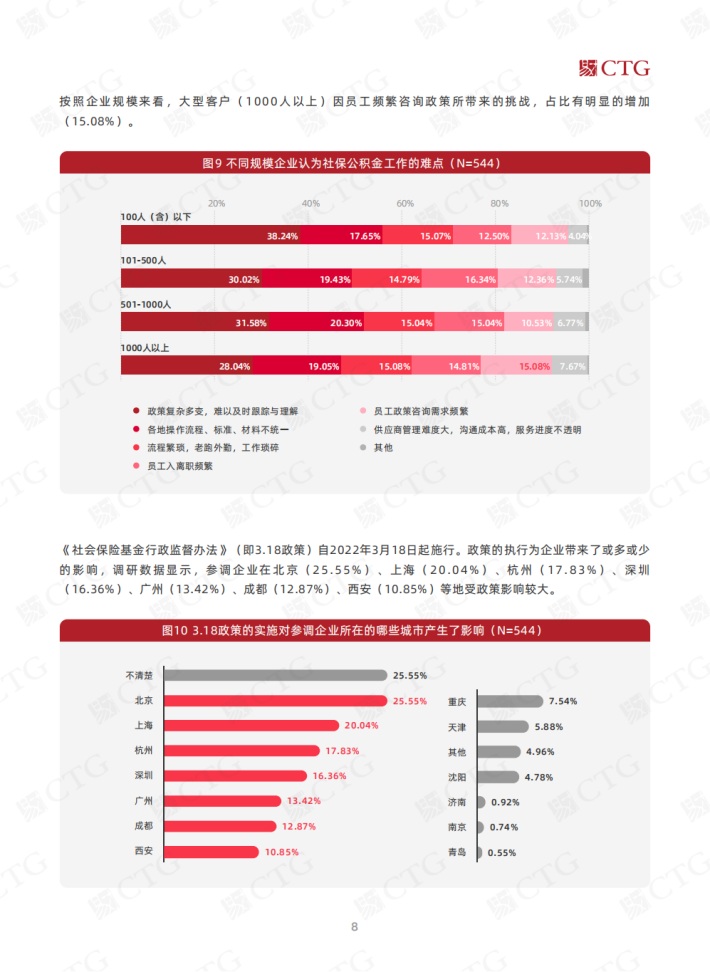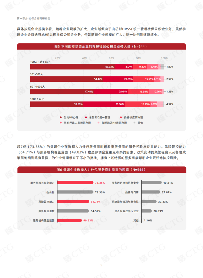 具体按照企业规模来看,随着企业规模的扩大,企业越倾向于由总部HRSSC统一管理社保公积金业务。虽然参调企业会首选当地HR办理社保公积金业务,但是随着企业规模的扩大,这一比例则逐渐缩小。