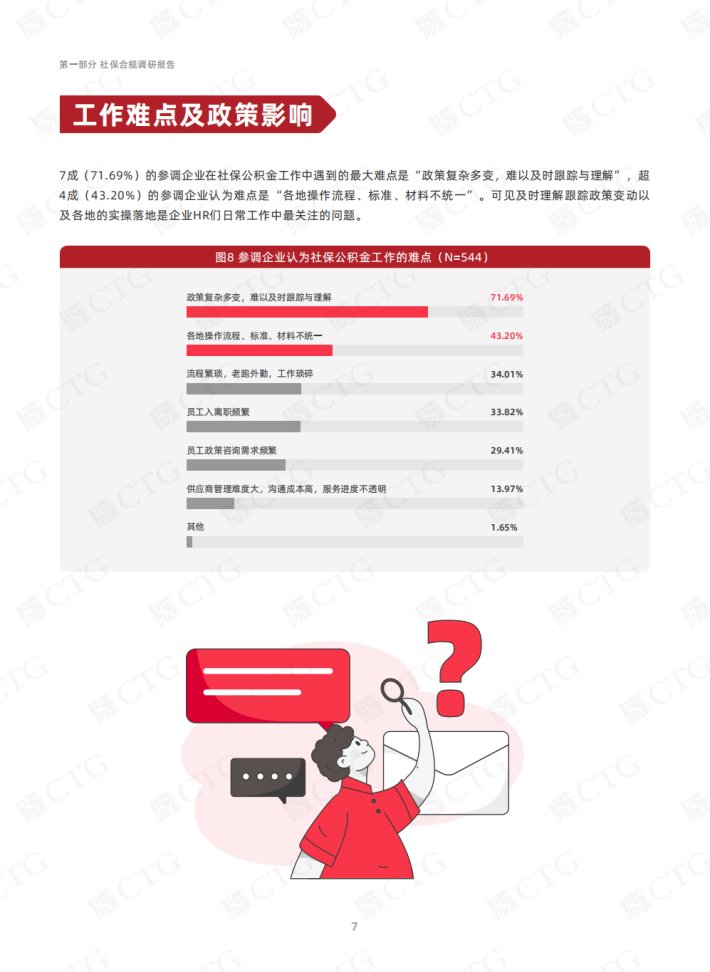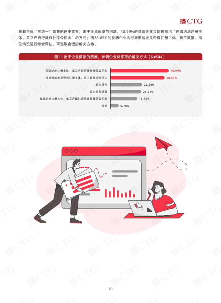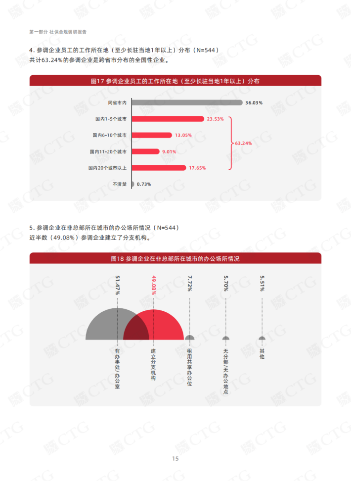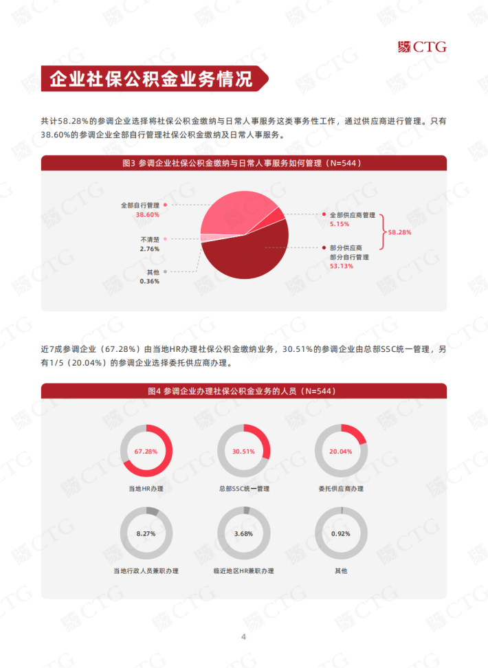 近7成参调企业(67.28%)由当地HR办理社保公积金缴纳业务,30.51%的参调企业由总部SSC统一管理,另有1/5(20.04%)的参调企业选择委托供应商办理。