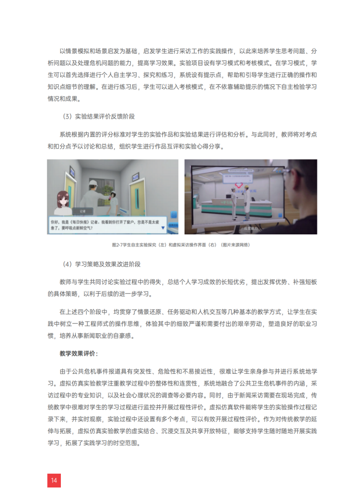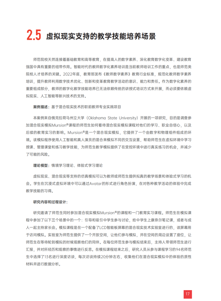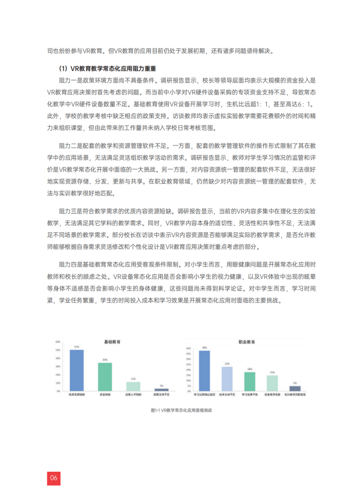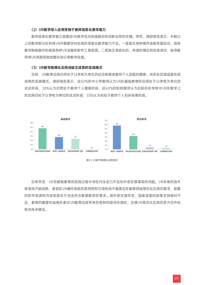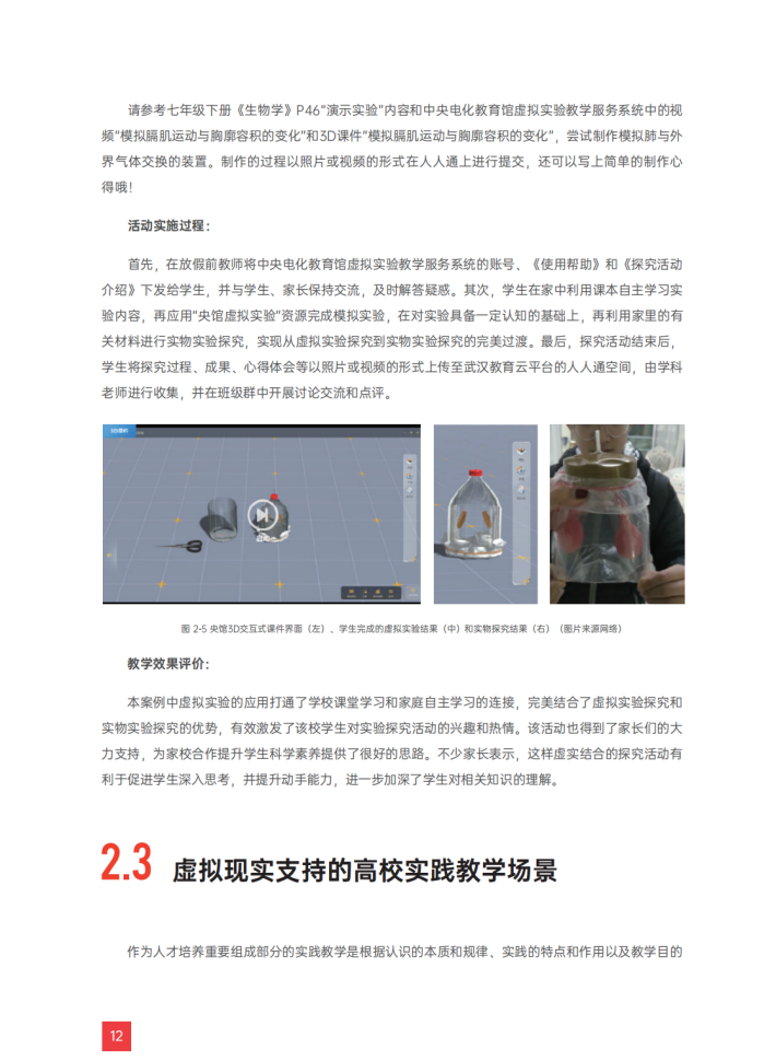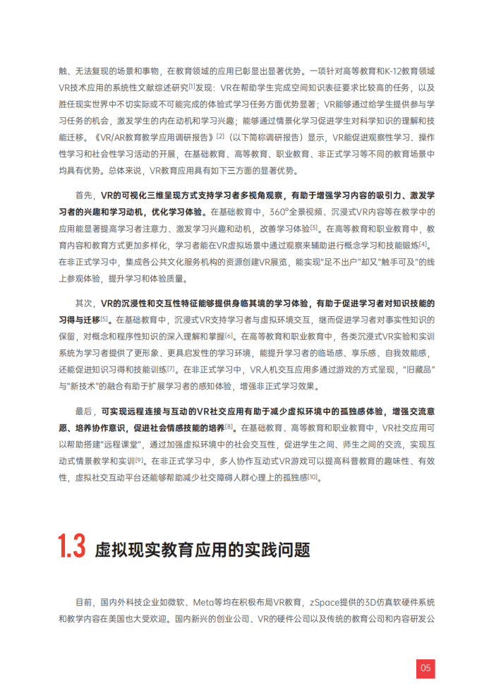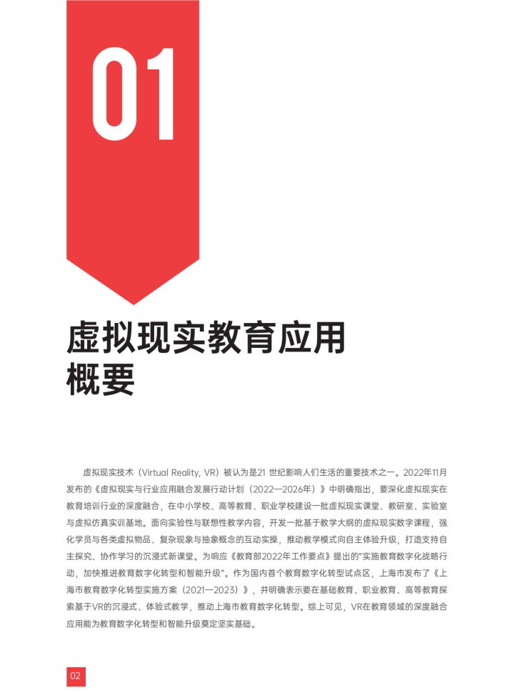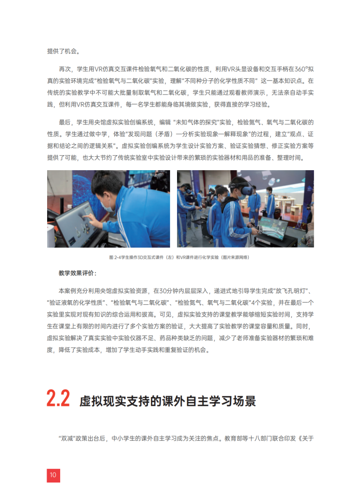 随着VR产业的不断成熟,世界各国纷纷对VR等新兴技术在教育领域的应用进行战略布局。近两年,工信部、教育部等五部委发布《虚拟现实与行业应用融合发展行动计划(2022—2026年)》和《元宇宙产业创新发展三年行动计划(2023-2025年)》,明确指出要深化虚拟现实在教育培训行业的深度融合,推进构建虚拟教室、虚拟实验室等教育教学环境,鼓励通过平台共享虚拟仿真实验实训资源,扩大优质教育资源覆盖面。当前,VR技术在我国教育系统的应用已经全面渗入基础教育、高等教育和职业教育领域,形成VR支持的集体课堂学习、小组研讨学习、自主探究学习、职业技能学习和教师素养培训等典型应用场景。同时,由建设虚拟仿真实验基地和平台、智慧校园、智慧教室等基础设施升级为打造沉浸式课堂等创新教学模式,形成了VR支持的沉浸式翻转课堂教学模式、Cloud VR支持的虚实融合职业技能实训模式,以及VR支持的教-学-评一体化实践教学模式。