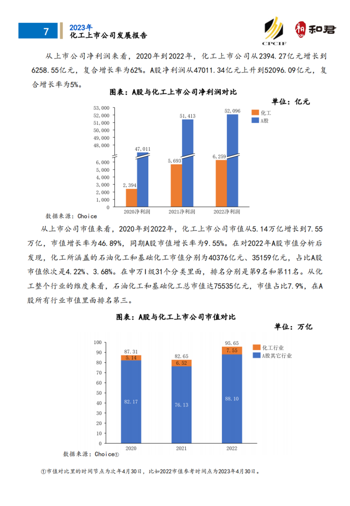 3、化工上市公司市值排名全行业前三。在对2022年A股市值分析后发现,化工所涵盖的石油化工和基础化工市值分别为40376亿元、35159亿元,占比A股市值依次是4.22%、