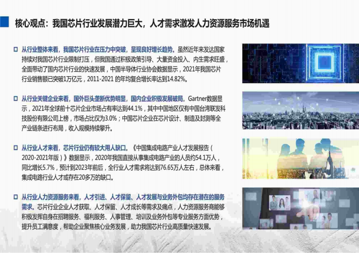 从行业人力资源服务来看,人才引进、人才保留、人才发展与业务外包均存在潜在的服务需求。芯片行业企业人才获取、人才保留、人才成长等需求及痛点,人力资源服务商能够积极发挥自身在招聘服务、福利服务、人事管理、培训及业务外包等专业服务方面优势,提升员工满意度,帮助企业聚焦核心业务发展,助力我国芯片行业高质量快速发展