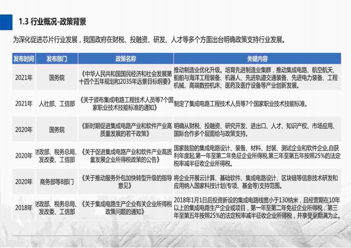 政策全面鼓励芯片行业发展。长期以来一直通过大批量进口满足自身需求,自身生产制造能力较弱,但受于外部环境的持续变化,为保障自身数字产业发展,强化国家安全,我国从政策、金融等多渠道鼓励芯片行业发展。