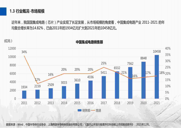 从行业整体来看,我国芯片行业在压力中突破,呈现良好增长趋势。虽然近年来发达国家持续对我国芯片行业限制打压,但我国通过积极政策引导、大量资金投入、内生需求旺盛,全面带动了国内芯片行业的快速发展,中国半导体行业协会数据显示,2021年我国芯片行业销售额已突破1万亿元,2011-2021的年均复合增长率达到14.82%。