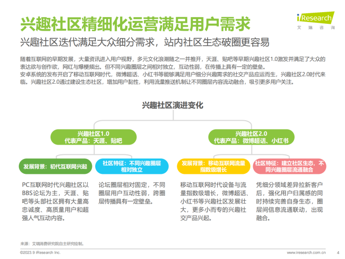 随着移动互联网兴起,兴趣社区从单一的大垂类社区逐渐向包容性更广、更细分的领域发展演进,短平快的兴趣社区逐渐替代了需要长时间浏览的贴吧与论坛。2023年4月天涯论坛宣布关闭,兴趣社区1.0时代结束。