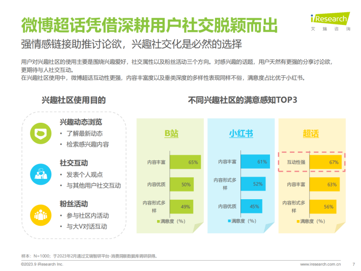 用户对兴趣社区的使用主要是围绕兴趣爱好,社交属性以及粉丝活动三个方向。对感兴趣的话题,用户天然有更强的分享讨论欲,更期待与人社交互动。在兴趣社区使用中,微博超话互动性更强,内容丰富度以及垂类深度的多样性表现同样不俗,满意度占比优于小红书。