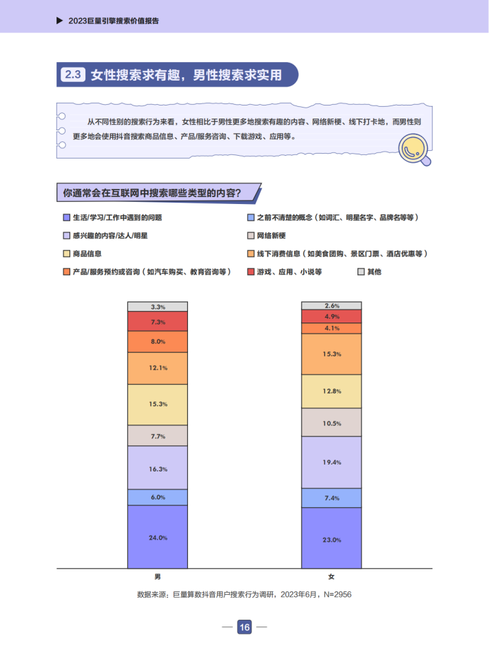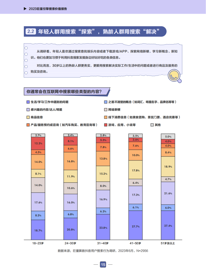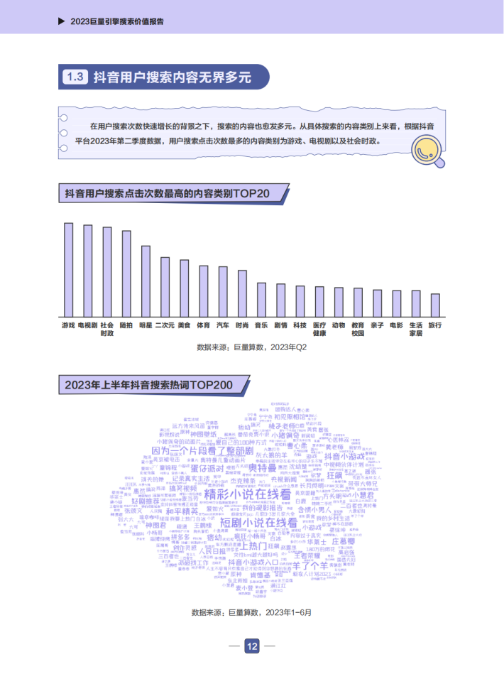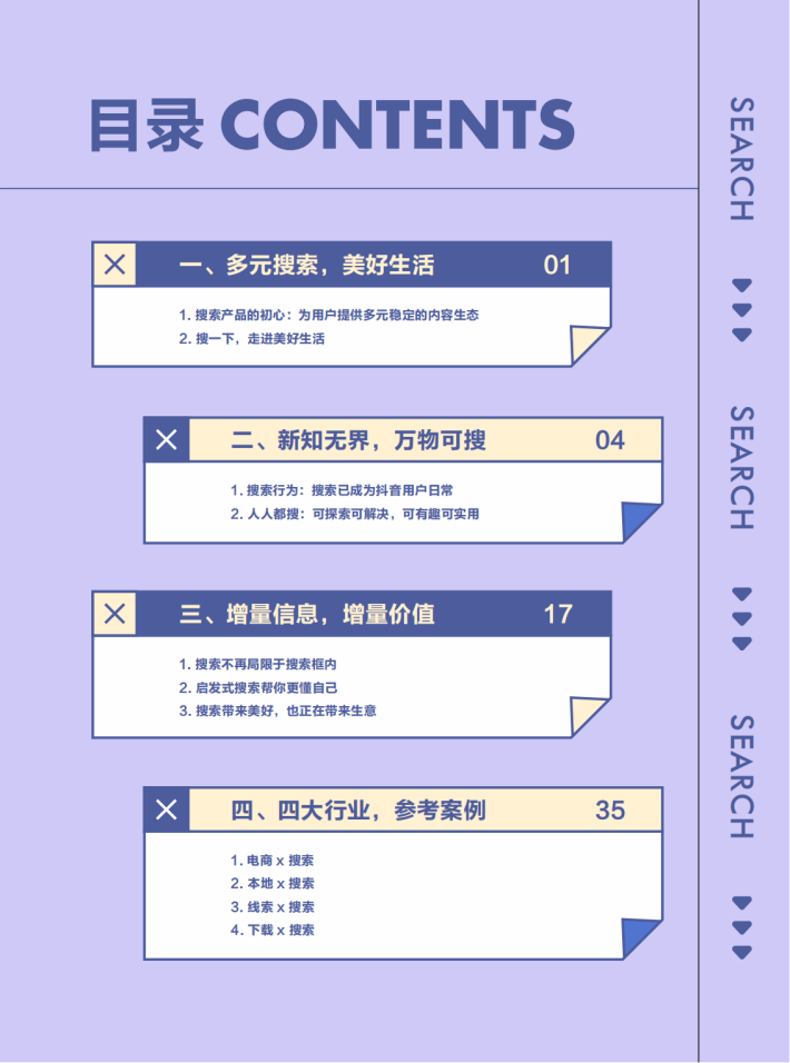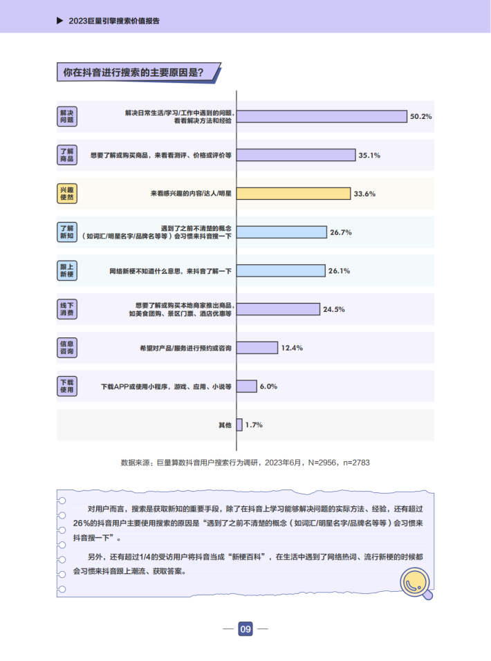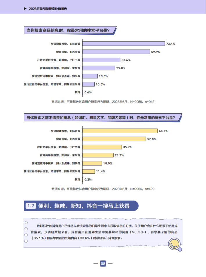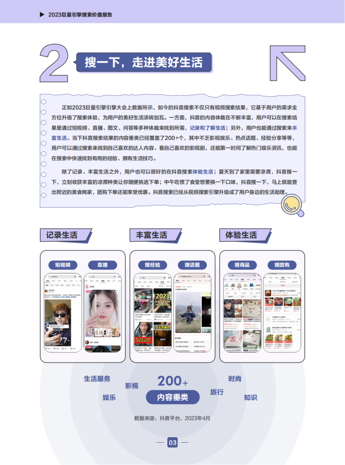 近年来,巨量搜索引擎的相关数据快速增长,抖音搜索关键词泛化到了各行各业。用户打开抖音搜索的已经不仅仅是娱乐类信息,更是包括了餐饮美食、电商购物、工作学习等多方面的需求。现在的抖音搜索已经是一个综合性的搜索引擎。