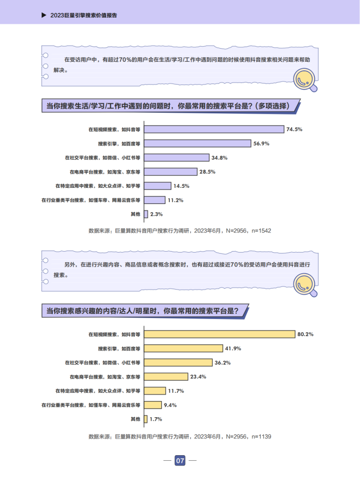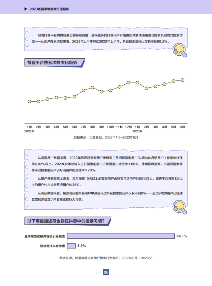 2023年上半年,每个用户平均每天在抖音上发起3次搜索行为,而且这一数据还在不断增长。不管是主动在搜索框发起搜索,还是通过视频评论区、标题区、底部相关推荐区关键词等等启发式搜索,都已经成为了抖音用户的日常习惯。