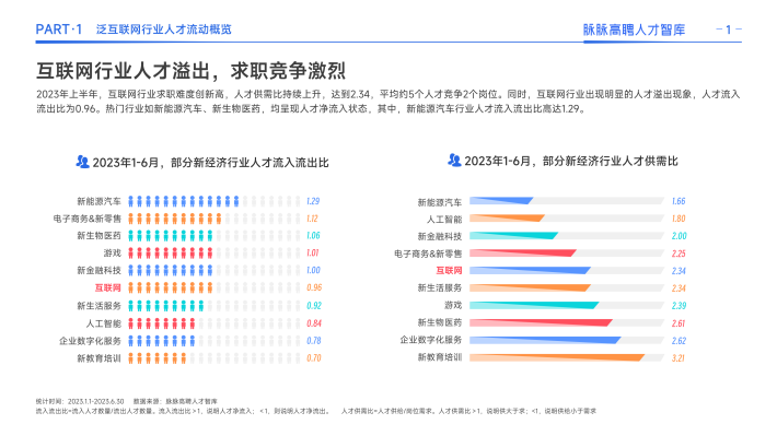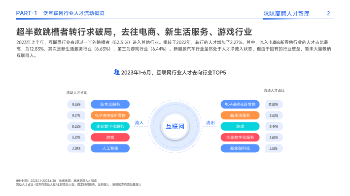 与此同时,互联网行业的招聘需求也随行业动荡出现几番起伏。2021年下半年开始,互联网行业结束了多年的扩张态势,招聘需求持续走低,人才供给持续走高,人才竞争加剧。2021年互联网行业人才供需比为0.45,2022年达到1.69,2023年更升至2.34。同时,互联网人才呈现净流出态势,外溢到电商零售、新生活服务、游戏等行业。